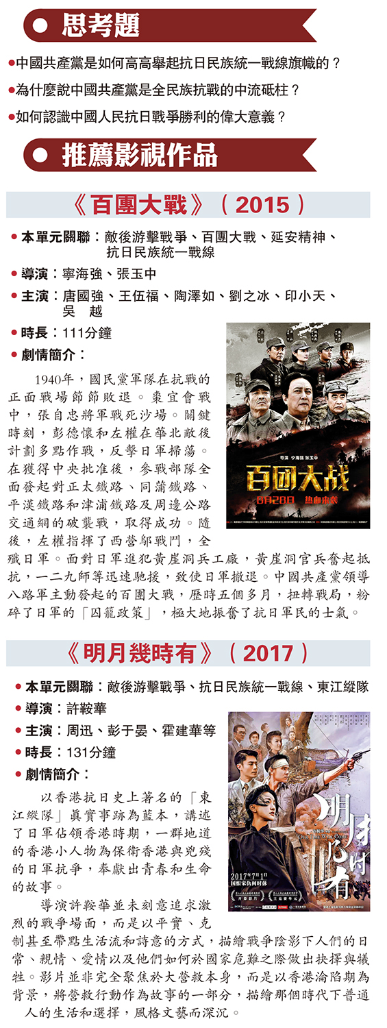 •本單元關聯:敵後游擊戰爭、百團大戰、延安精神、抗日民族統一戰線