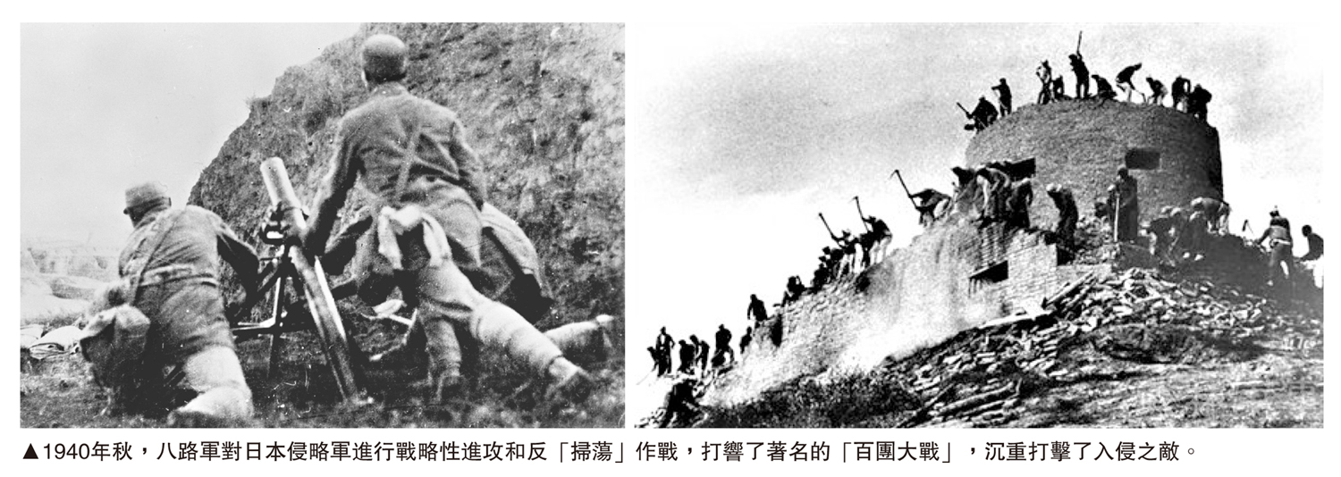 1940年8月至翌年1月,八路軍總部在華北發動了一次大規模的對日軍的進攻。8月20日夜,參戰部隊、游擊隊、民兵同時發起攻擊,陸續參戰的部隊達到105個團20餘萬人,這就是百團大戰。至1940年12月初,敵後軍民共作戰1824次,斃傷日、偽軍2.5萬餘人,俘日軍281人、偽軍1.8萬餘人,破壞鐵路470餘公里、公路1500餘公里。