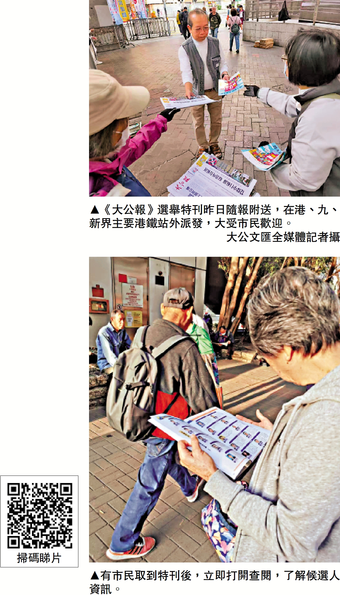 大公報記者現場見到,排隊領取特刊的市民絡繹不絕。有市民取到特刊後,立即打開查閱,了解自己所屬選區的候選人資訊。