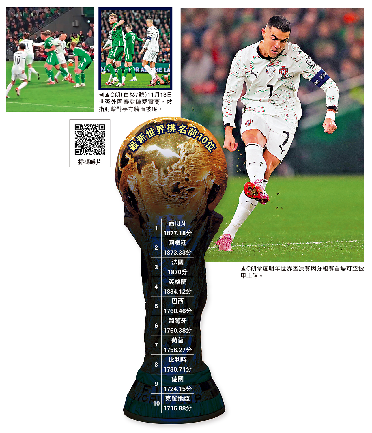 葡萄牙球星C朗拿度可望明年世界盃首仗即可上陣。這名40歲前鋒兩周前在世界盃外圍賽對愛爾蘭時,因肘擊對方守將而領紅被逐,按例需要停賽3場,這代表他將錯過世盃決賽周的分組賽首兩場賽事。不過國際足聯周二公布的紀律裁決結果叫外界十分意外,雖然維持其停賽3場的處罰,但其中兩場獲緩期執行。由於C朗已經在世盃外最後一場外圍賽停賽,意味着他決賽周分組賽首仗已可上陣。\大公報記者 梁潤森