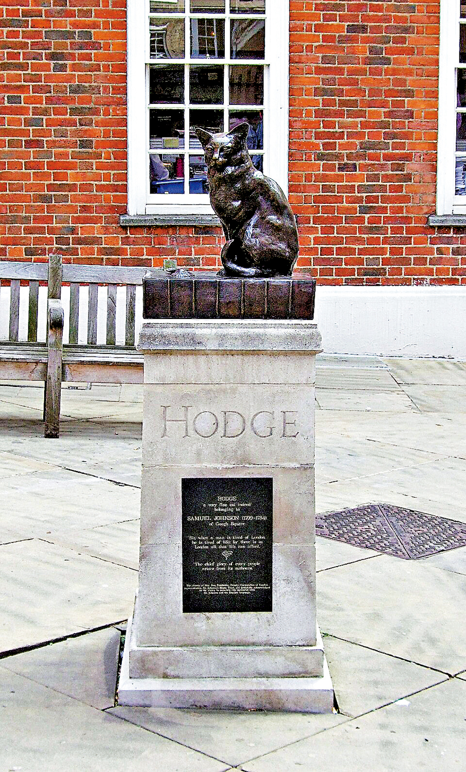 貓向來是雕塑家喜愛的主題,倫敦高夫廣場的霍奇貓(Hodge)雕塑無疑是其中的傑作。只見牠端坐在一本翻開的書上,旁邊是一個打開了殼的牡蠣,書上有一行文字:「確實是一隻非常好的貓」,署名塞繆爾,他正是以「如果厭倦了倫敦,就厭倦了生活」而聞名的十八世紀英國著名詩人。現實中,霍奇貓是塞繆爾的寵物,《塞繆爾傳》中描述了他如何寵溺霍奇:「他,以免和牠相處不悅。」也就是說,塞繆爾為了避免貓被僕人欺負,經常帶牠一起出門並親自照顧,包括為牠買新鮮的牡蠣。當時英格蘭沿海地區盛產牡蠣,因此價格並不昂貴。但時間一長,吃牡蠣的霍奇還是出了名。一九九七年時任倫敦市長羅傑·庫克爵士為紀念塞繆爾,在他的舊居前面的高夫廣場建成該雕塑。如今其已成一個旅遊景觀,很多遊客走過雕塑時,都習慣性地將硬幣放入牡蠣殼中,作為好運的象徵,而每逢特殊場合和紀念日,還可以看到一條粉紅色的絲帶繫在霍奇的脖子或牡蠣殼上。