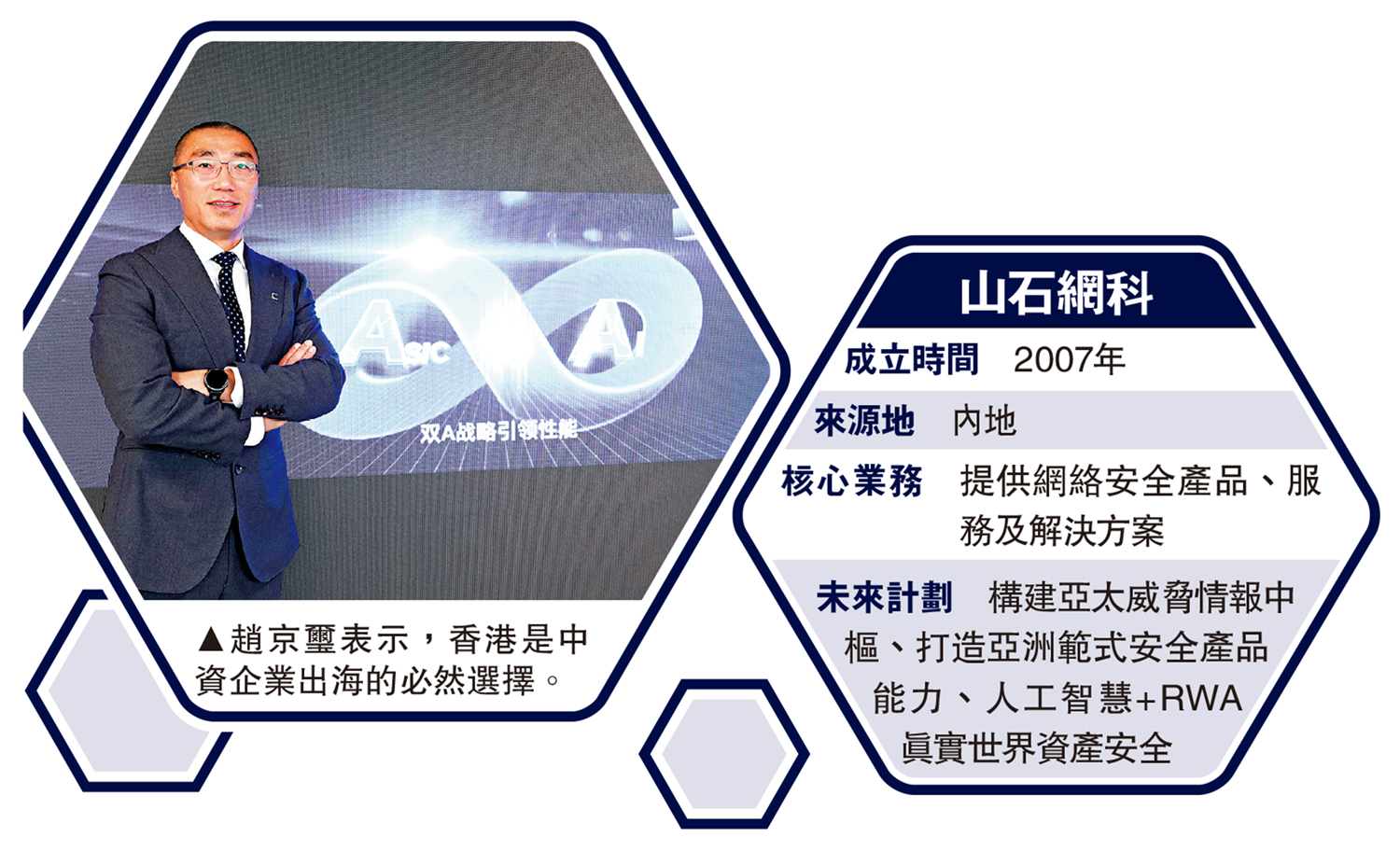 數碼港園區企業山石網科推動「ASIC+AI」(即ASIC安全專用芯片和人工智能)的雙A戰略,解放算力和人力。該公司副總裁兼國際事業群負責人趙京璽表示,自去年明確「深耕港澳、輻射東南亞、面向全世界」的新藍圖以來,海外市場業務規模已實現翻倍增長。他強調,香港臨近內地,是「一帶一路」樞紐和面向東南亞的窗口,加上特區政府對企業的多元扶持和人才引進政策,使其成為中資企業出海的「必然選擇」。