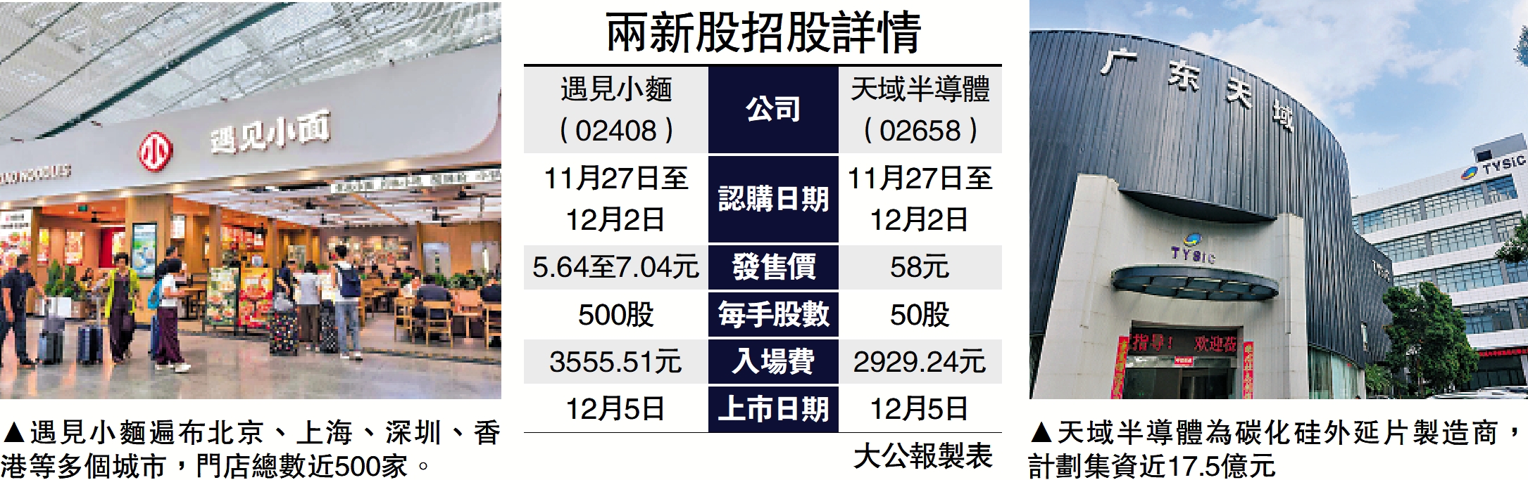 以中式麵館為主打的廣州遇見小麵(02408)由昨日(11月27日)至12月2日招股,擬發售9736.45萬股H股,香港公開發售佔10%,國際配售佔90%;每股招股價介乎5.64至7.04元,集資最多6.85億元。以每手500股計,入場費3555.51元,預期將於12月5日掛牌。