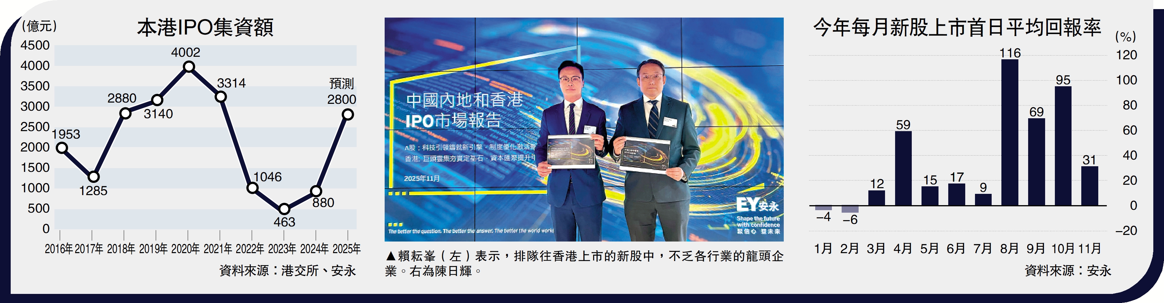 今年香港新股市場迎來強勢復甦。據專業服務機構安永推算,2025年全年集資總額將達2800億元,為4年新高,按年大漲218%,有望位居全球首位;新股數量逾100宗,按年增加43%。