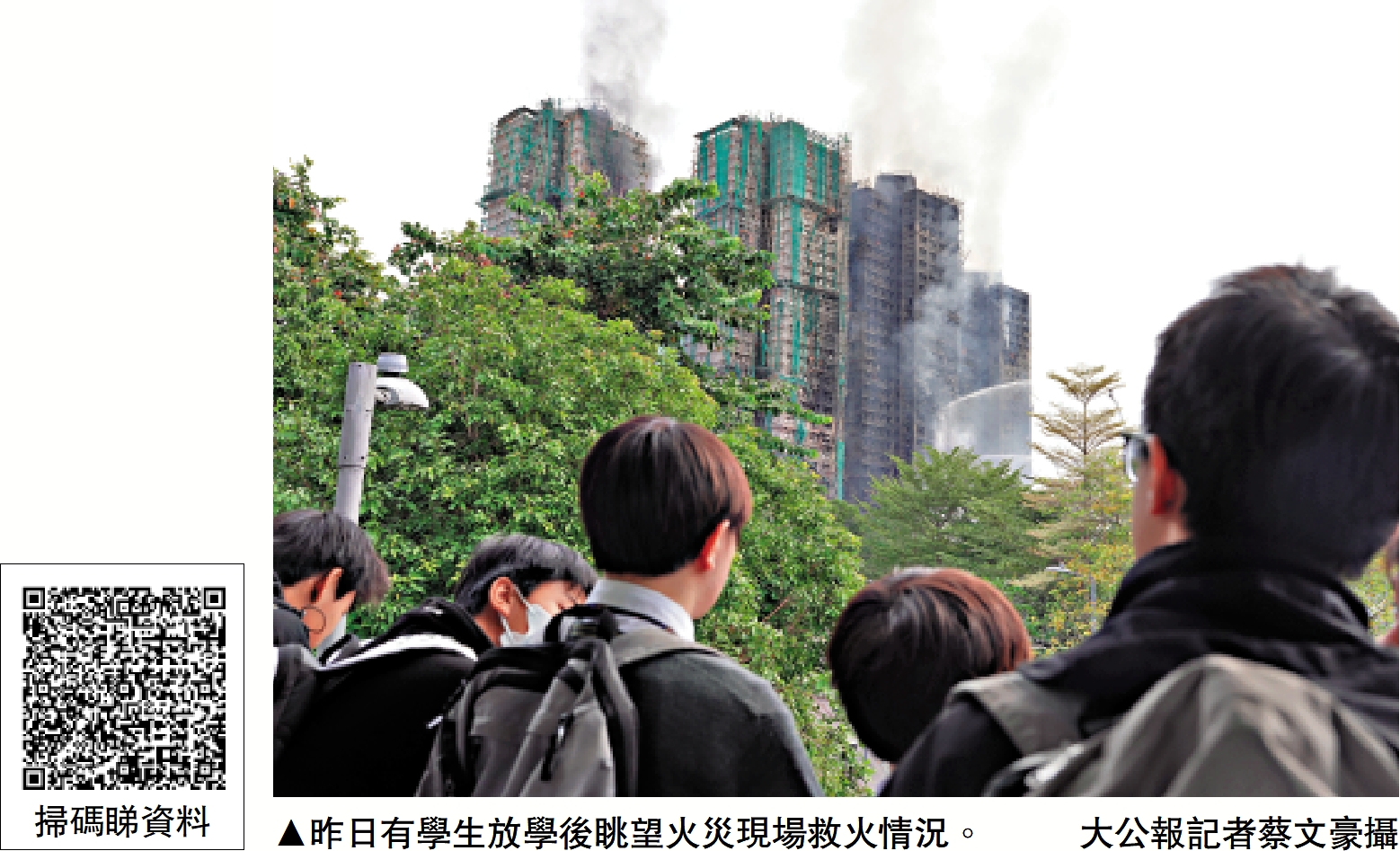 大埔宏福苑五級火焚燒一天有多,造成死傷慘重,截至截稿前共有14所本港學校停課或考試延期。大公報記者昨日到宏福苑附近學校了解情況,有同學表示難以入睡,有同學因朋友命喪火場昨日回到課室後不斷哭泣,更有多間學校的同學考試期間邊寫邊流淚。