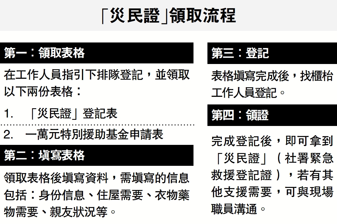 完成登記後,即可拿到「災民證」(社署緊急救援登記證),若有其他支援需要,可與現場職員溝通。