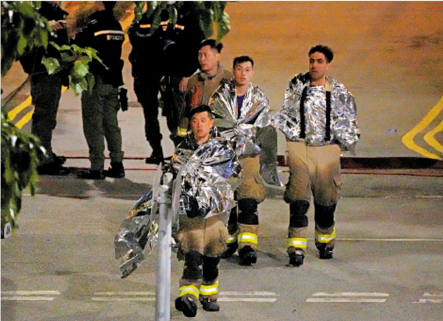 大埔宏福苑的五級大火焚燒近44小時,昨日上午10時許終被撲熄,死亡人數增至128人,包括一名殉職的消防員。消防昨日對七座大廈超過1800個單位持續進行爆破,確保沒有被困人士。入夜後,在焚燒變黑的大樓內,不時交織着搜索的電筒強光。