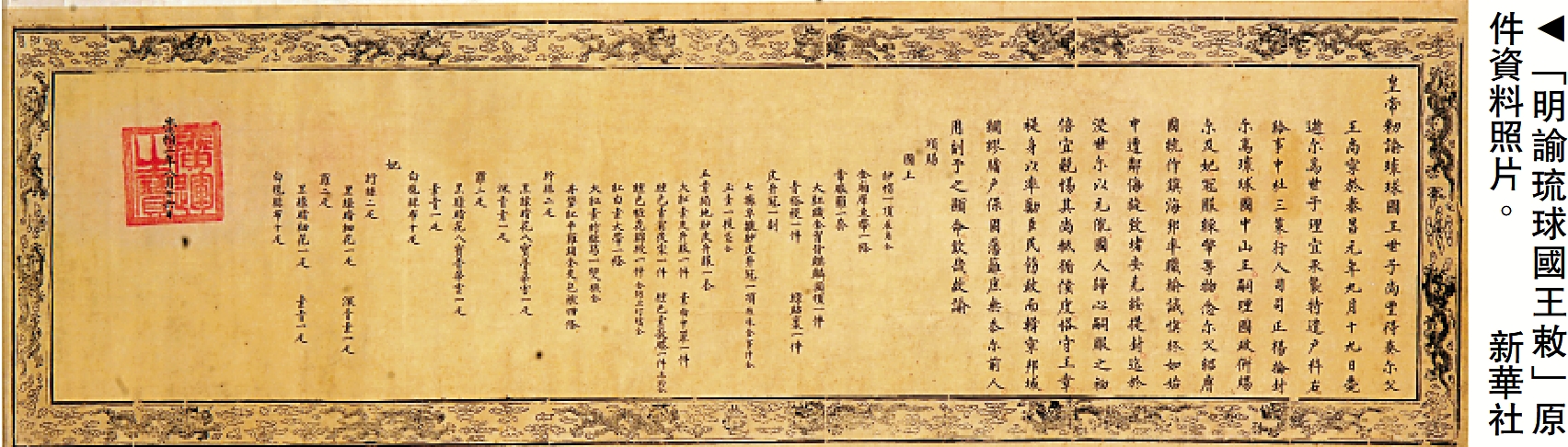 這次展出的「明諭琉球國王敕」係仿製品,原件存放於旅順博物館庫房。敕諭落款為明崇禎二年(公元1629年),為黃色紙本,四周有金色雲龍花紋,鈐有「廣運之寶」朱文方印,行文採用工整的楷書。
