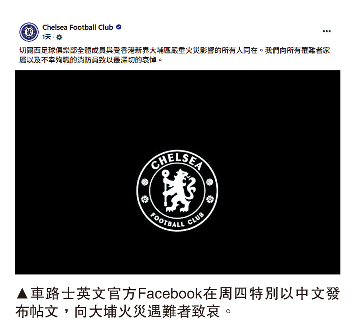 車路士的官方Facebook,一向都以英語為主要發布內容的語言載體,不過官網在周四便特別以中文發布文章,為大埔火災遇難者致哀,他們僅以全黑背景配上黑白的車路士會徽,寫上「切爾西(即港譯車路士)足球俱樂部全體成員與受香港新界大埔區嚴重火災影響的所有人同在。我們向所有罹難者家屬以及不幸殉職的消防員致以最深切的哀悼。」該貼文發布後,至今已經有近千回應及近500次分享,很多香港車路士球迷都紛紛留言感謝愛隊的關切。
