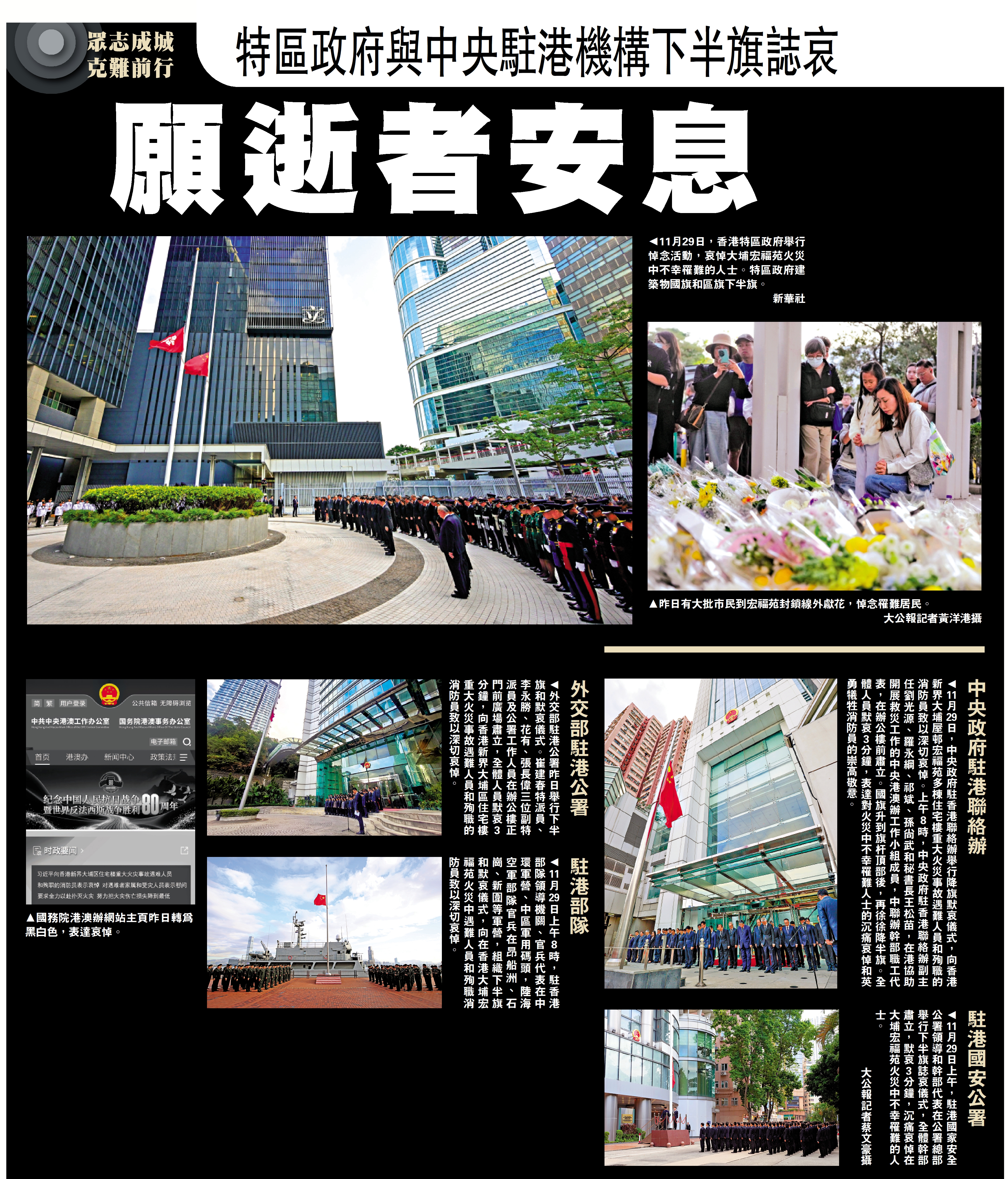 【大公報訊】新華社報道:29日上午,香港特區行政長官李家超聯同特區政府主要官員、公務員等在政府總部舉行悼念活動,沉痛哀悼大埔火災中不幸罹難者。