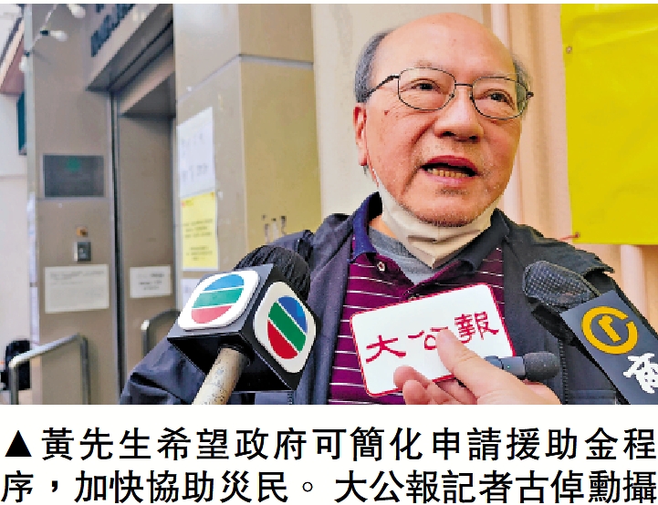 黃先生說,前日中午12時申請災民證及1萬元援助,整個過程用了快三個小時,覺得排隊時間過長,且每個申請要分開排隊,程序繁複,每一條隊都大排長龍,光是申請災民證就要一個半小時,對大家都不便。他希望政府簡化程序,加快協助災民。