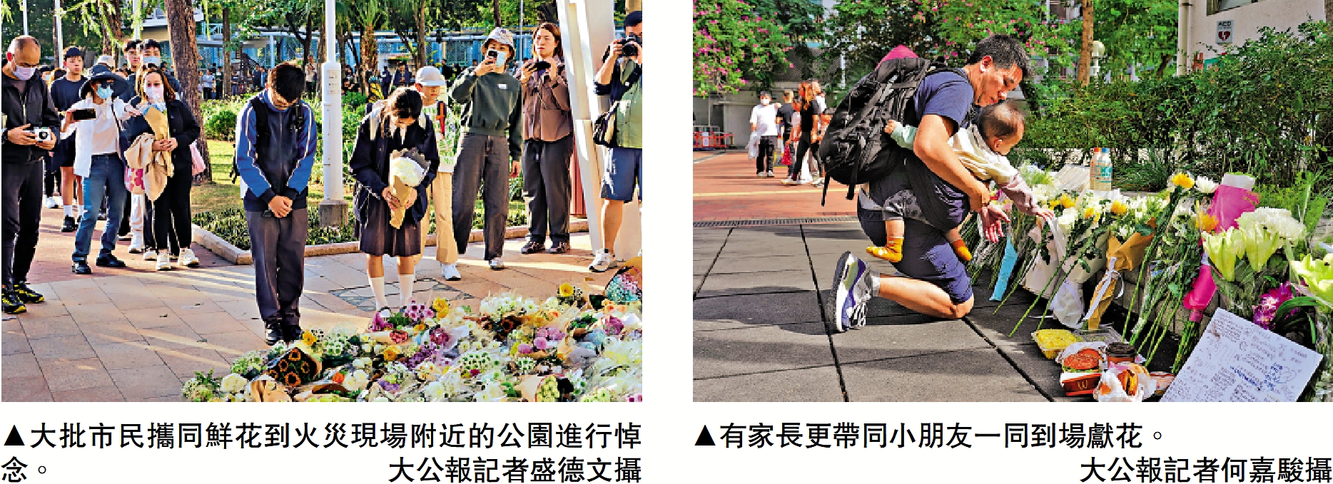【大公報訊】記者盛德文、黃佩琳報道:大埔宏福苑一場無情大火,摧毀無數家園,至今造成二百多人死傷。現場仍未解封,連日來不斷有市民前往宏福苑對出的休憩處獻花悼念死難者。昨日下午起,專程到場獻花悼念的市民絡繹不絕,人龍最長時有數十米。大家都愁眉深鎖,有的難掩悲痛飲泣。