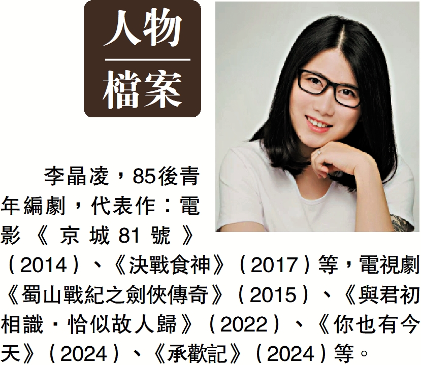 李晶凌,85後青年編劇,代表作:電影《京城81號》(2014)、《決戰食神》(2017)等,電視劇《蜀山戰紀之劍俠傳奇》(2015)、《與君初相識·恰似故人歸》(2022)、《你也有今天》(2024)、《承歡記》(2024)等。