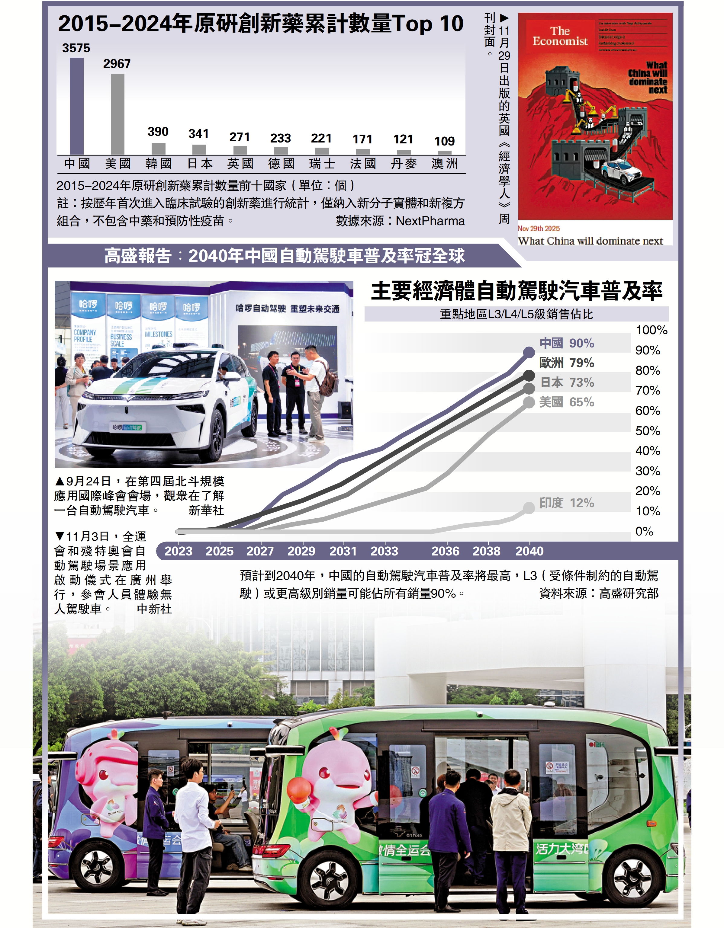 「中國是全球創新速度最快的市場。」德國汽車巨擘、大眾汽車集團(中國)董事長兼首席執行官貝瑞德早前出席進博會受訪時如是說。11月29日出版的新一期英國《經濟學人》周刊封面故事,以「接下來中國將主導什麼領域」為主題。報道指出,中國正在加速成為全球兩大新興前沿技術的領導者:自動駕駛汽車和藥物開發。繼在電動汽車和太陽能電池板領域取得重大成就後,中國在這些新領域的快速創新,正影響全球市場並展現其技術進步力量。