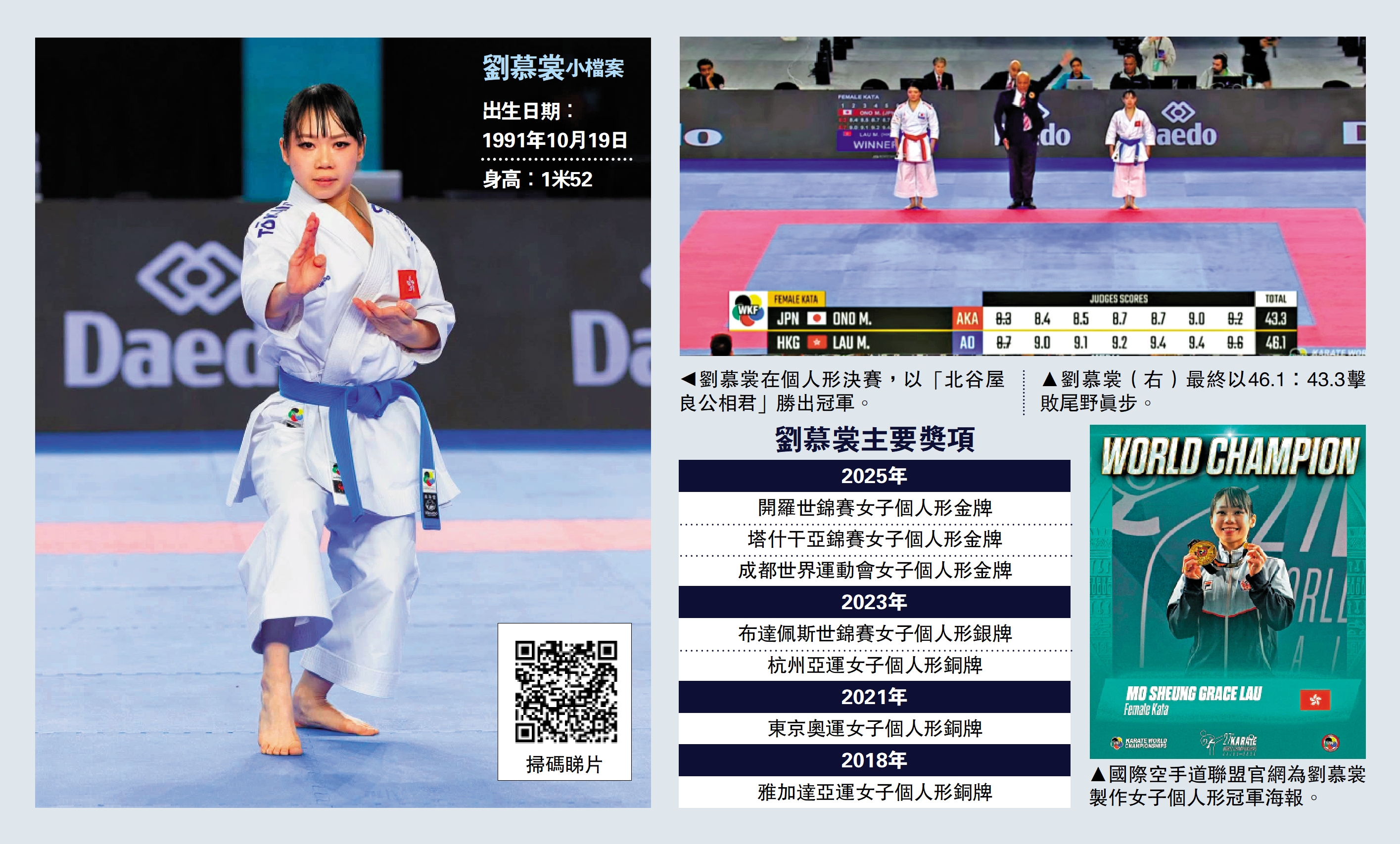 中國香港空手道名將劉慕裳於11月30日在埃及開羅舉行的世界空手道錦標賽女子個人形項目決賽中,以46.1分對上尾野真步的43.3分、2.8分的優勢勝出,成功擊敗日本勁敵尾野真步奪得金牌,成為香港首位空手道世界冠軍。作為目前世界排名第一的劉慕裳終於得償所願,實現個人職業生涯中重要里程碑。\大公報記者 張銳