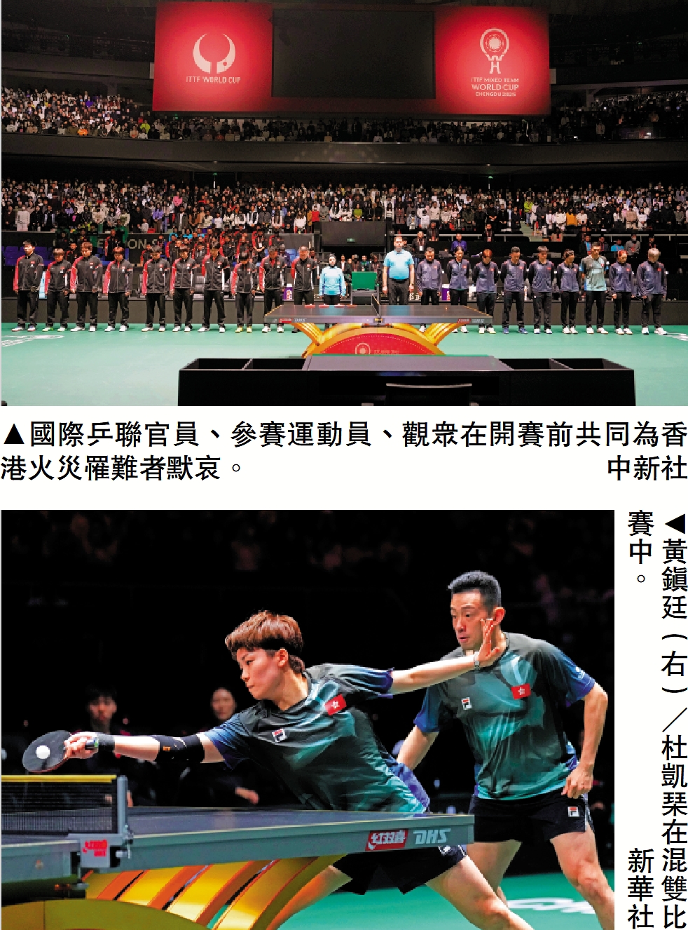 【大公報訊】記者張銳報道:2025成都國際乒聯混合團體世界盃11月30日開賽,中國香港隊在小組賽首場對陣國家隊,最終以局數1:8不敵。賽前,全場萬名觀眾起立,為大埔宏福苑大火中的遇難者默哀一分鐘,港乒球員的袖子上並佩戴了小白花。