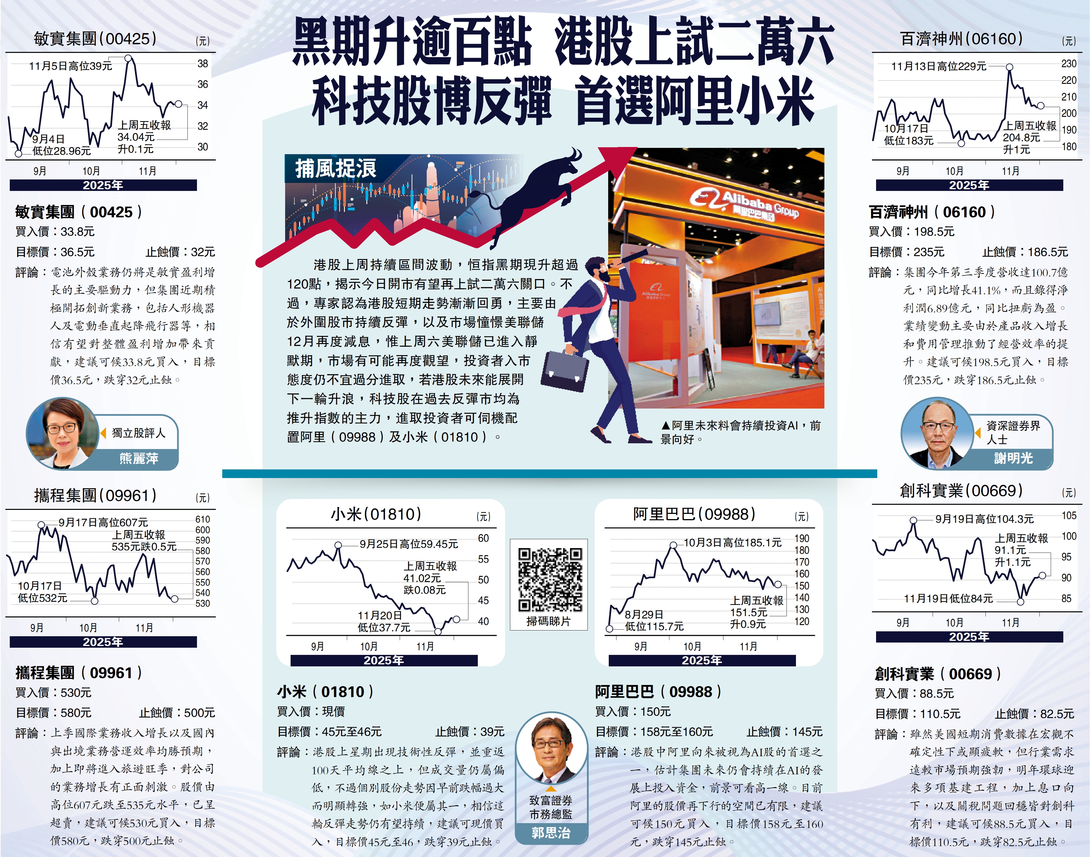 港股上周持續區間波動,恒指黑期現升超過120點,揭示今日開市有望再上試二萬六關口。不過,專家認為港股短期走勢漸漸回勇,主要由於外圍股市持續反彈,以及市場憧憬美聯儲12月再度減息,惟上周六美聯儲已進入靜默期,市場有可能再度觀望,投資者入市態度仍不宜過分進取,若港股未來能展開下一輪升浪,科技股在過去反彈市均為推升指數的主力,進取投資者可伺機配置阿里(09988)及小米(01810)。