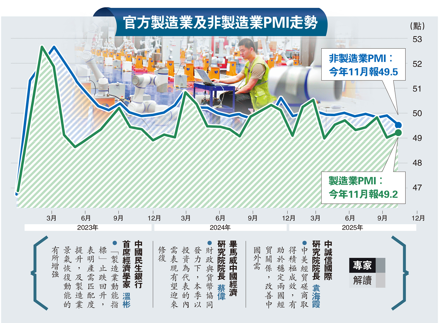國家統計局發布的11月中國製造業PMI較前值提升0.2個百分點至49.2,非製造業PMI較前值下降0.6個百分點至49.5。國家統計局服務業調查中心首席統計師霍麗慧介紹,上月製造業景氣水平有所改善,高技術製造業保持擴張的同時,市場預期穩中有升,中國經濟景氣水平總體平穩。分析稱,11月製造業內外需有所恢復,生產活動持續趨穩,主要分項指標多有所回升,表明中國製造業總體延續趨穩恢復勢頭,但內需擴張政策節奏仍需加快。\大公報記者 倪巍晨