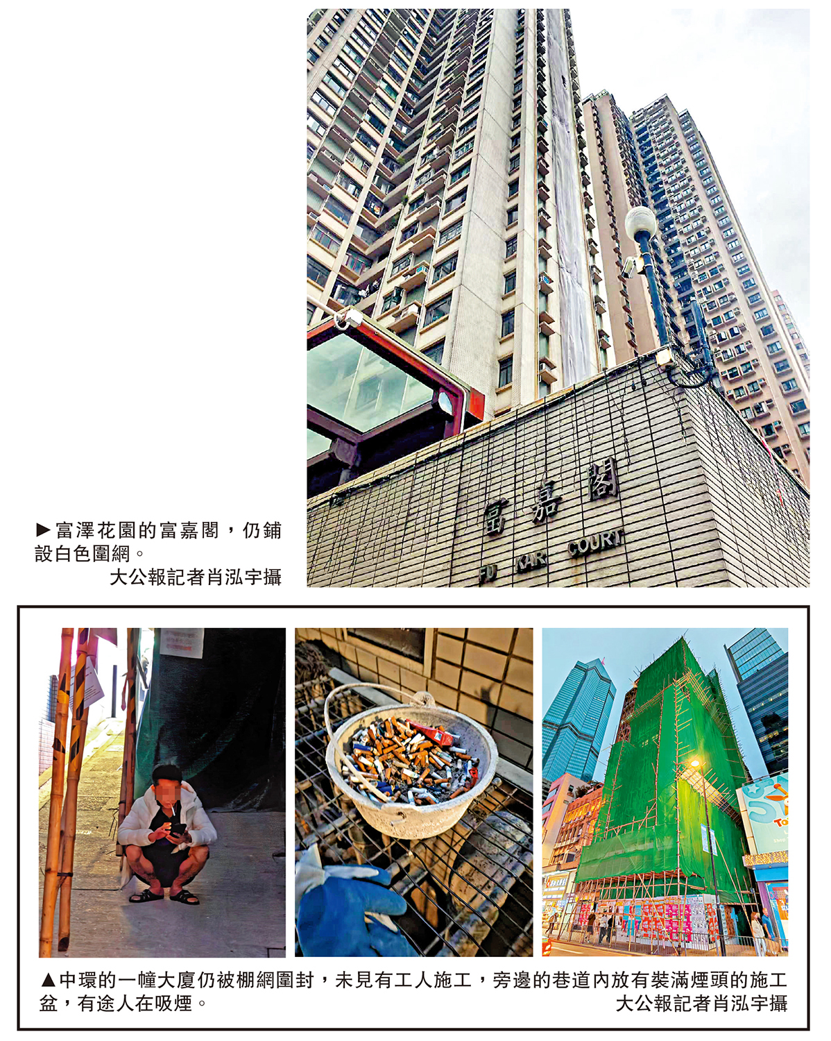 大公報記者昨日走訪被屋宇署下令停工的兩個維修工程項目,其中位於北角的富澤花園維修工程,現場所見塑膠板已被拆卸,有居民建議政府應加強工地用料規管;在中環的一幢大廈則仍被棚網圍封,不少人在大廈旁邊的巷道內吸煙。\大公報記者 易曉彤、肖泓宇