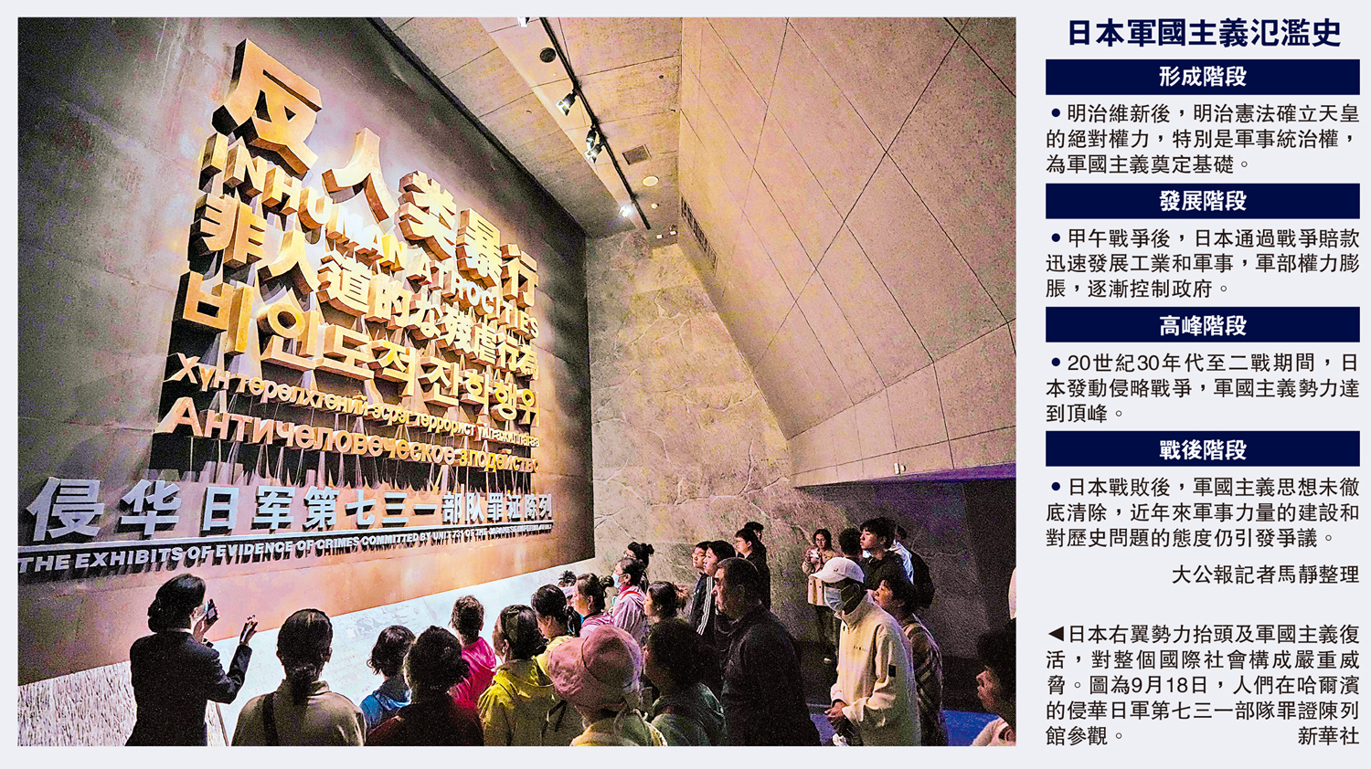 評論普遍認為,日本右翼勢力抬頭及軍國主義復活,高市組閣後從修憲、強軍、擴武三個方面不斷推進冒險政策,不僅於日本發展不利,更將對包括中國在內的周邊國家乃至於整個國際社會構成嚴重威脅,國際社會必須高度警惕日本借「台灣有事就是日本有事」公然破壞戰後國際秩序、復活軍國主義的危險動向。\大公報記者 馬靜