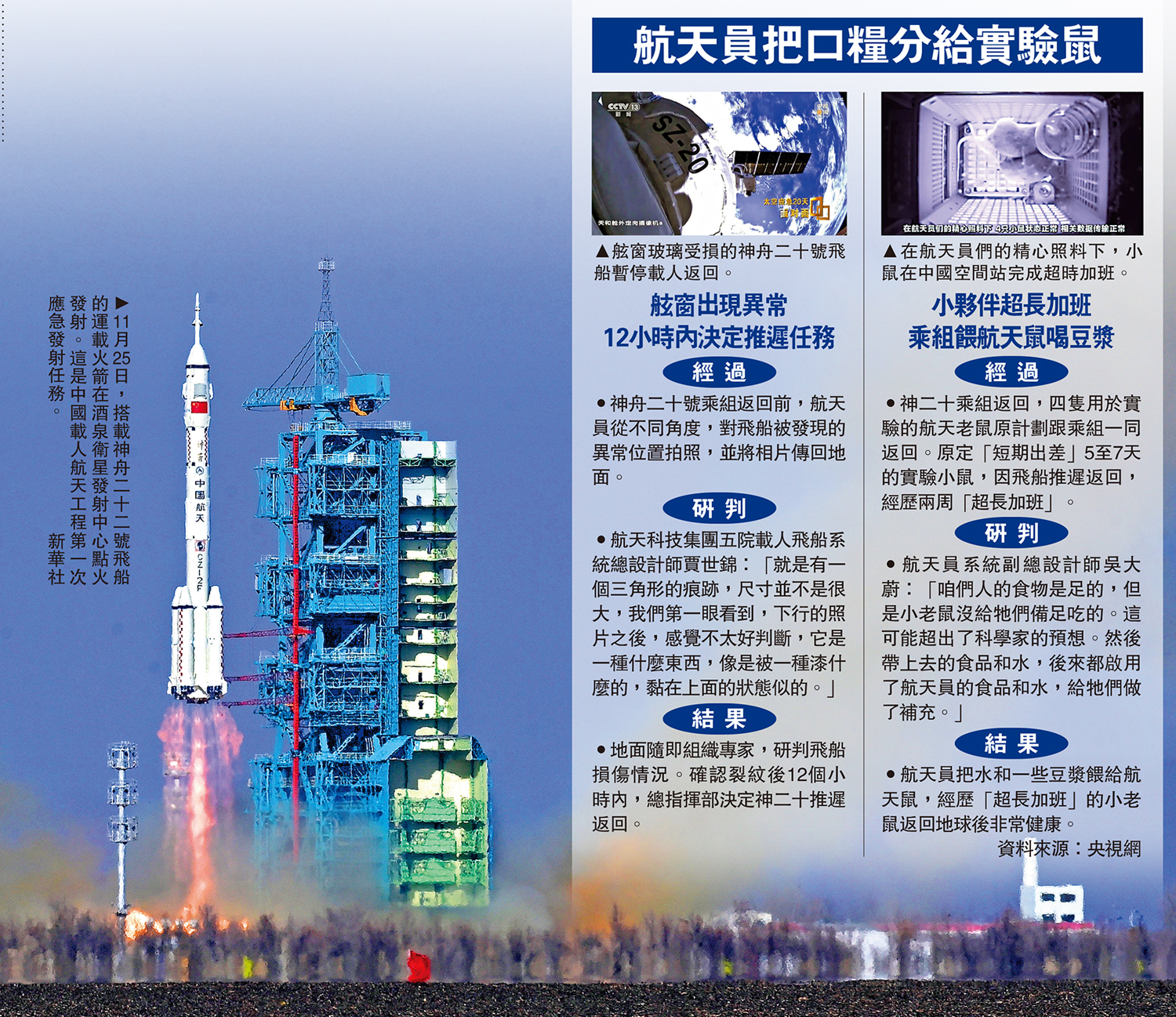 •神二十乘組返回,四隻用於實驗的航天老鼠原計劃跟乘組一同返回。原定「短期出差」5至7天的實驗小鼠,因飛船推遲返回,經歷兩周「超長加班」。