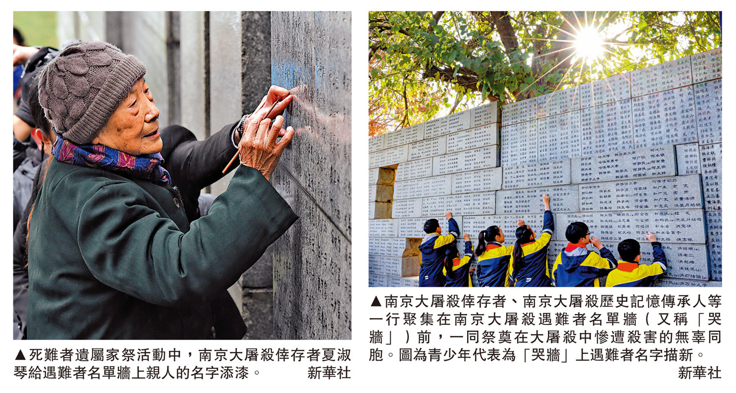 【大公報訊】據新華社報道:第十二個國家公祭日到來前,南京大屠殺死難者家庭祭告活動於11月30日啟動。據統計,今年又有8位南京大屠殺倖存者去世,在世倖存者僅剩24人。一大早,倖存者夏淑琴、劉民生帶着家人,趕到侵華日軍南京大屠殺遇難同胞紀念館的「哭牆」前,鞠躬、獻花、默哀,祭奠在88年前遇難的親人和同胞。