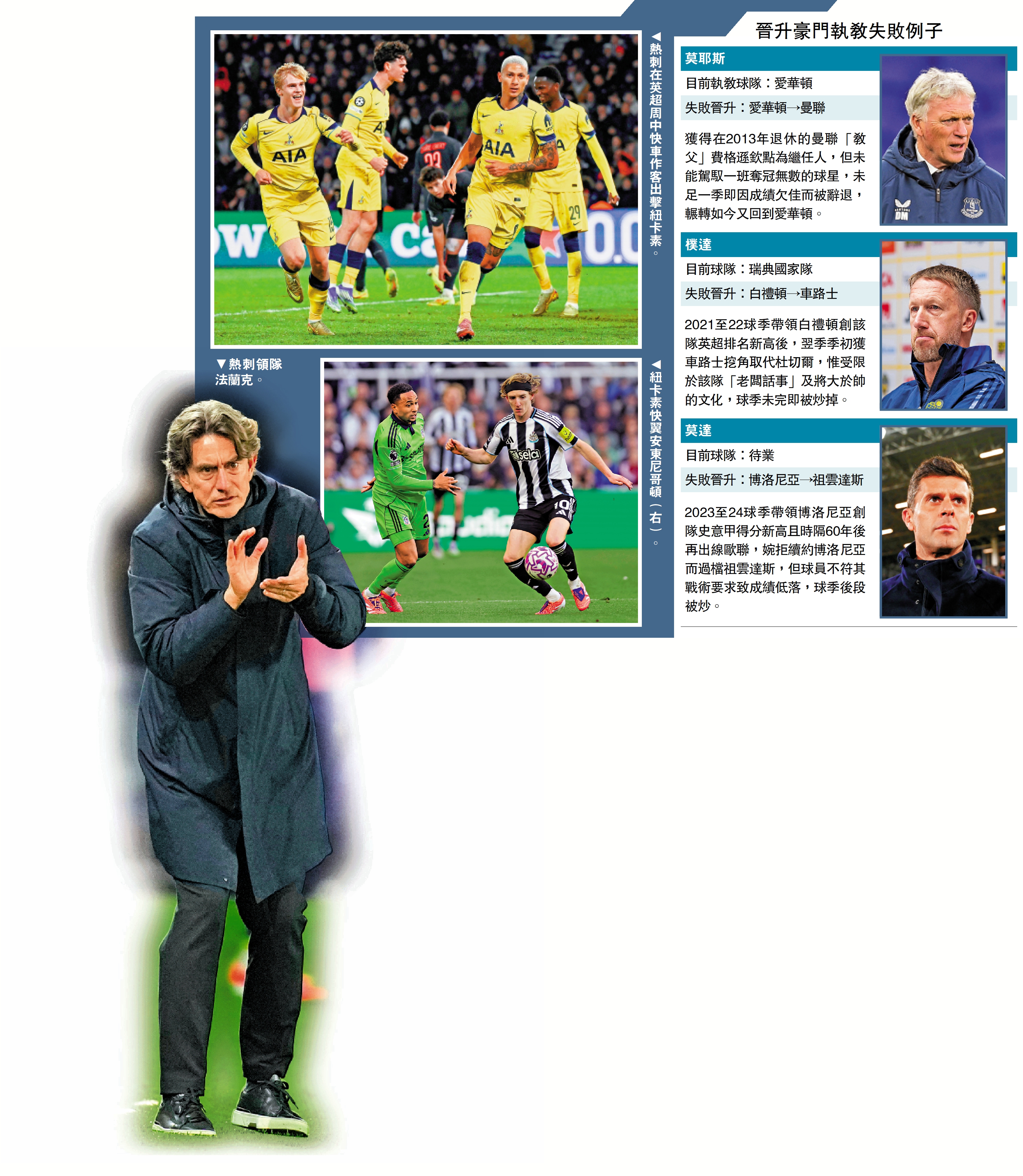 法蘭克之前帶領小球會賓福特在英超踢得頭頭是道,今季遂獲熱刺招手接掌帥印,季初戰績尚算理想,然而近期卻拾級而下,近7場所有賽事5度吃敗後,領軍能力隨即受到質疑,更有報道指會方正考慮以前巴塞隆拿教頭沙維取而代之。法蘭克以往在賓福特戰術清晰,惟來到熱刺後卻「調整過度」,時攻時守令球員無所適從,據報亦開始失去球員的信任,恐怕將要成為又一晉升大球會任教失敗的例子。\大公報記者 譚德龍