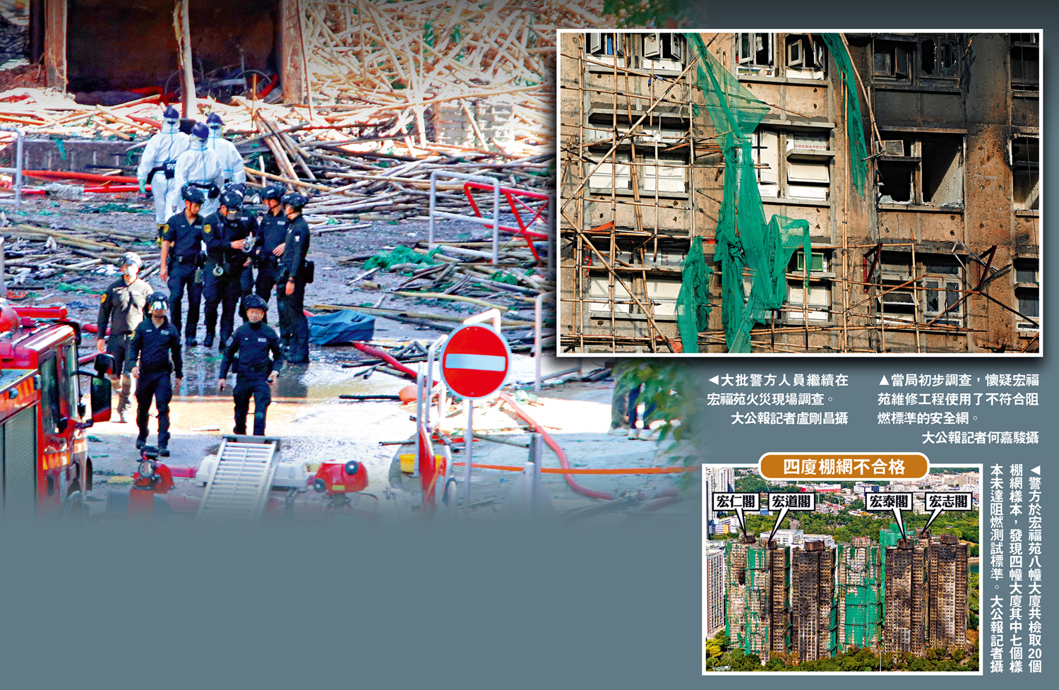 警方取得20個安全網樣本中,宏泰、宏道、宏仁和宏志四幢大廈共七個樣本的檢測結果,未達到應有的阻燃標準,可能與火災快速蔓延有關。20個安全網樣本來自宏福苑全部八座樓宇的高、中、低層各處,其中有平時打開窗就能剪取樣本的地方,也有一些平時很難取得樣本的,甚至需要消防員爬出去才能夠取得樣本的地方。