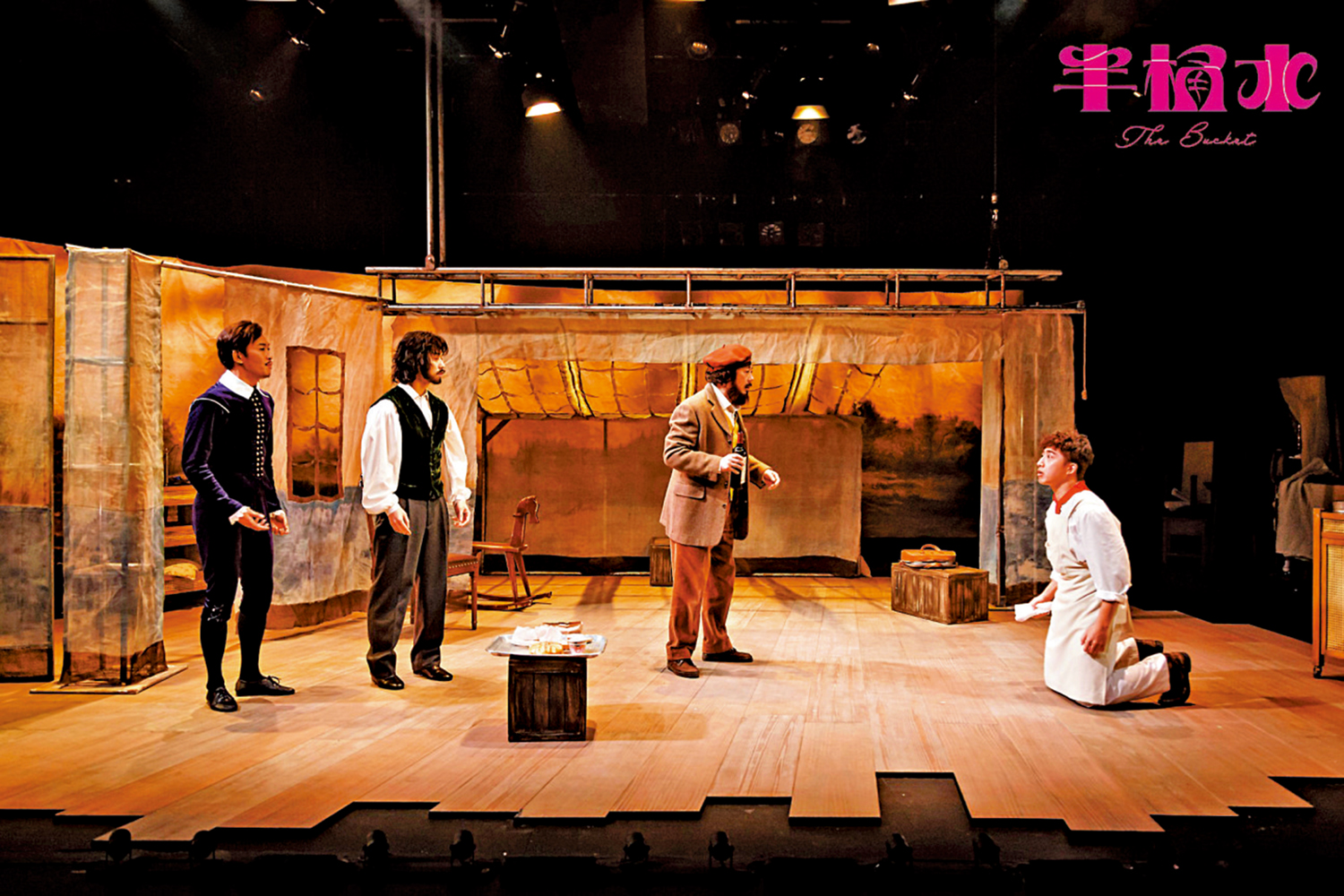 《半桶水》時代背景為「偽」文藝復興時期,但只得一個四男共處的陋室場景,毋須換景,主要通過妙語連珠啖落有味的對白,交代劇情和建立思辯,規模不大,而且題材荒誕,愈甩漏愈精糙反而愈好,加上有點戲中戲元素,搬上大舞台,若太過精雕細琢,未必合適。不過屯門大會堂文娛廳舞台空間不大,而且觀眾一眼就看到舞台左右兩側高懸「出口」燈牌,已有先天性的間離效果。演出大部分時間由黑色布幕作為背景,所有布景道具,由一個個有轆箱子組合拼砌,木塊拆下來成了畫布畫板,演員(高翰文)也可以藏在箱子裏,可拆可裝能收能放,運轉乾坤扭盡六壬,只是看着他們弄什麼出來搞什麼鬼,已有一定的娛樂性。