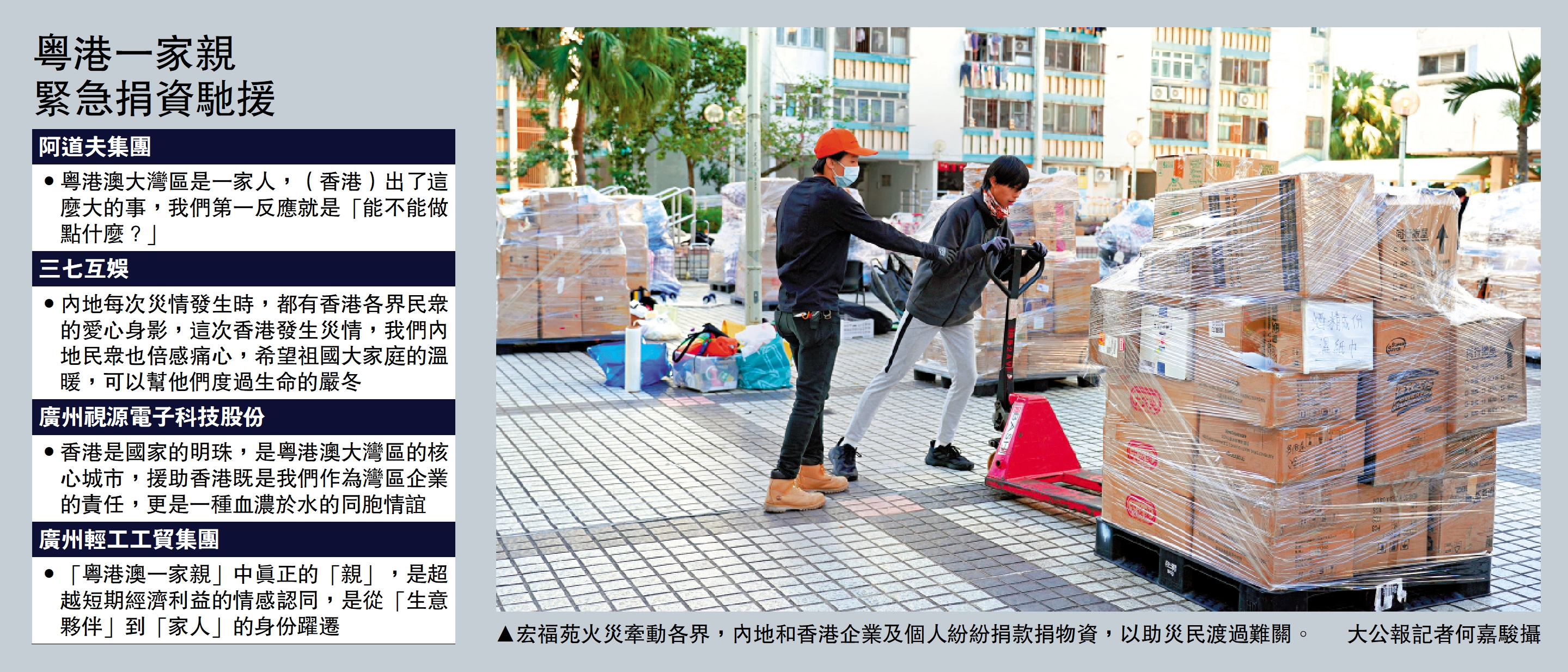 「粵港澳一家親,援助香港不僅是企業責任,更是血濃於水的同胞情誼。」香港大埔宏福苑火災發生後,一批愛心粵企主動擔當,第一時間捐出善款支援香港進行災後救援、重建等工作,企業負責人更不約而同地對記者說出這句話。有企業在火災發生後不到兩小時,便確定了各項捐贈細節;也有企業不到20小時就通過廣州市慈善會向香港紅十字會捐贈一筆200萬元的善款。患難之中,一衣帶水的粵港之間更顯真情。\大公報記者 李紫妍廣州報道