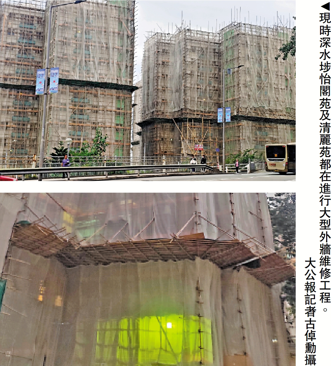 在深水埗清麗苑,至少三座大廈正拆卸棚網,窗外亦未有安裝任何膠板,屋苑有不少建築工人出入。