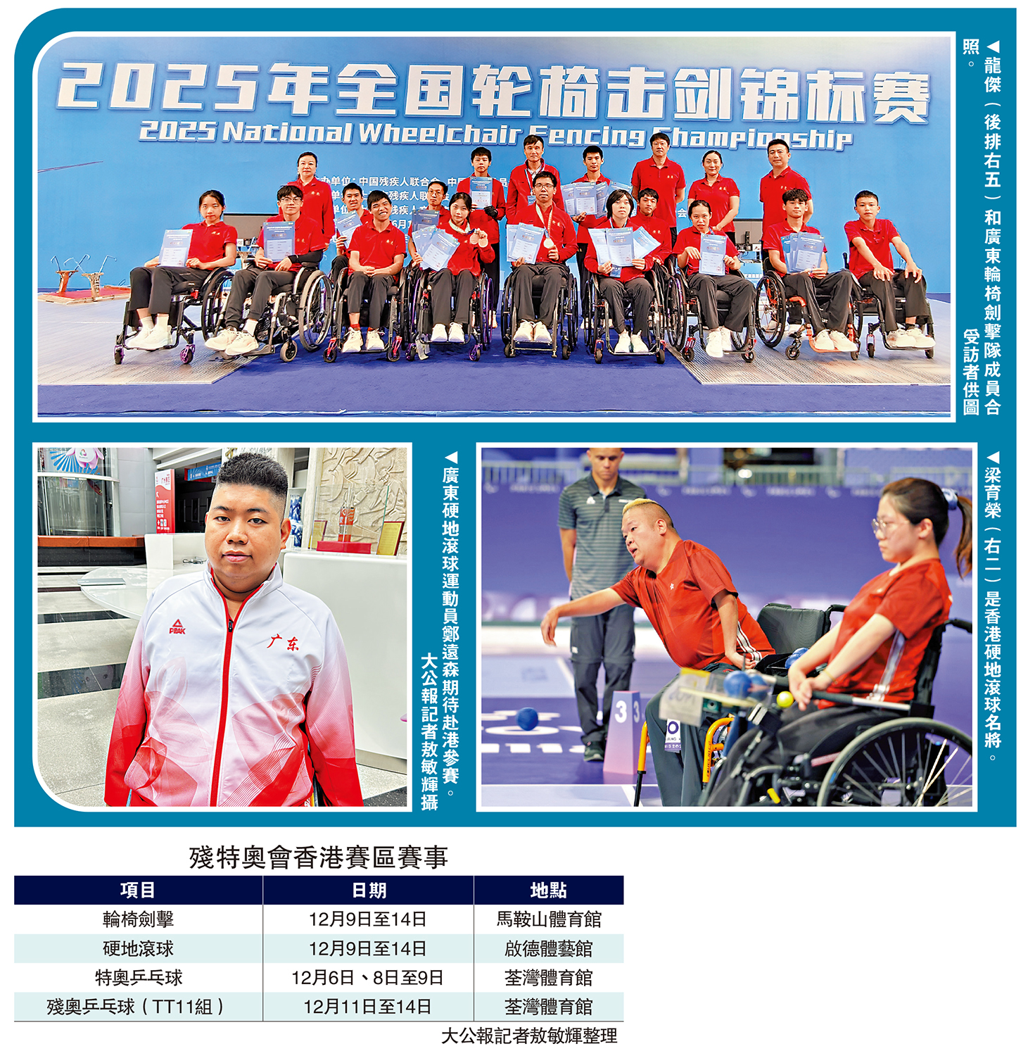 殘特奧會香港賽區3個項目正賽(硬地滾球、輪椅擊劍及乒乓球)即將打響,同為東道主,廣東體育健兒整裝待發。作為廣東硬地滾球項目首批運動員,鄭遠森在運動員生涯中獲得眾多世界冠軍、全國冠軍,此次他將在單人與雙人項目中向金牌發起衝擊,並期待與偶像、香港名將梁育榮同場競技。作為一位從廣州走向世界的傳奇教頭,廣東輪椅劍擊隊主教練龍傑僅用一年時間,便組建起廣東首支輪椅劍擊隊。他渴望這支新軍,能以「初生之犢」的勁頭,在香港馬鞍山體育館的賽場上展現拚搏精神,創造歷史。\大公報記者 敖敏輝、實習記者黃靖容廣州報道