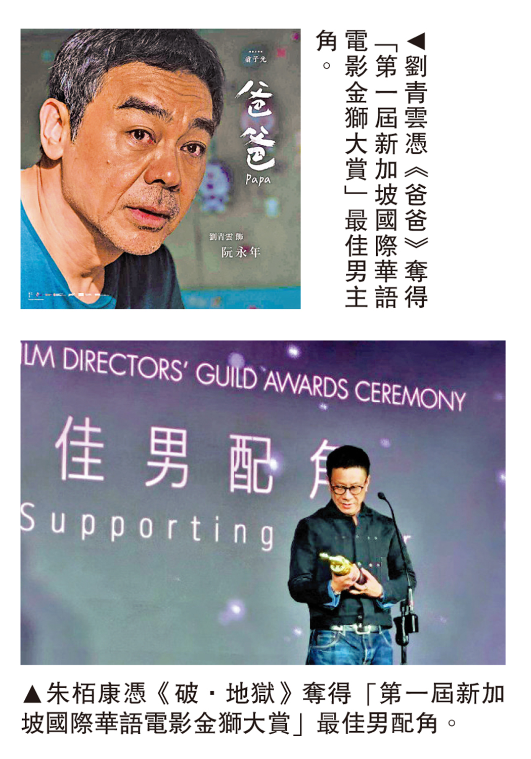 【大公報訊】「第一屆新加坡國際華語電影金獅大賞」12月1日於新加坡舉行,劉青雲憑《爸爸》奪得最佳男主角,擊敗許冠文與張孝全等大熱,成為該角色為劉青雲帶來第五座「最佳男主角」寶座。《爸爸》同時拿下「最佳導演」「最佳劇本」「最佳原創電影音樂」及「最佳剪輯」五大獎項,成為首屆金獅大賞最大贏家。「最佳電影」則由《破·地獄》奪得。
