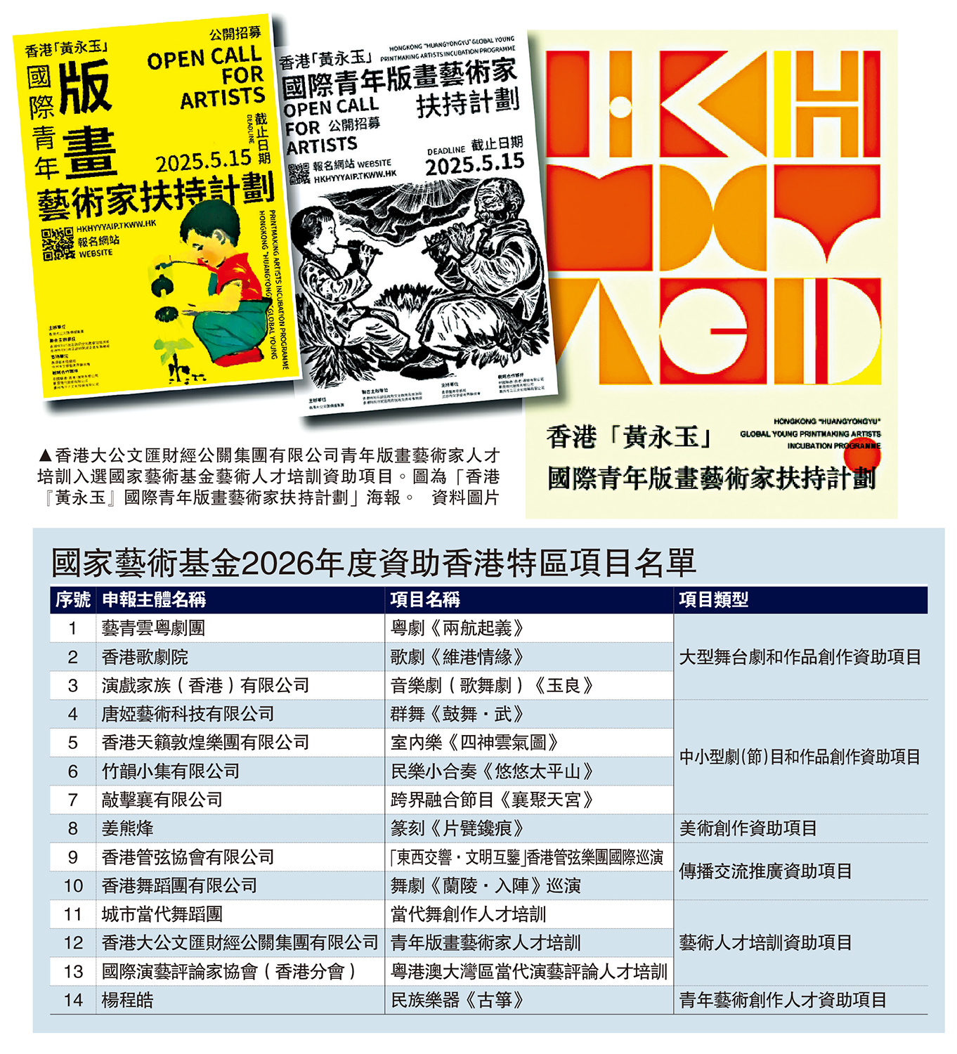 近日,國家藝術基金管理中心公示了國家藝術基金(一般項目)2026年資助項目名單,其中香港特區共有14個項目成功入選,創五年來新高。入選的香港項目包括大型舞台劇和作品創作資助項目3項、中小型劇(節)目和作品創作資助項目4項、傳播交流推廣資助項目2項、藝術人才培訓資助項目3項、美術創作資助項目1項、青年藝術創作人才資助項目1項。