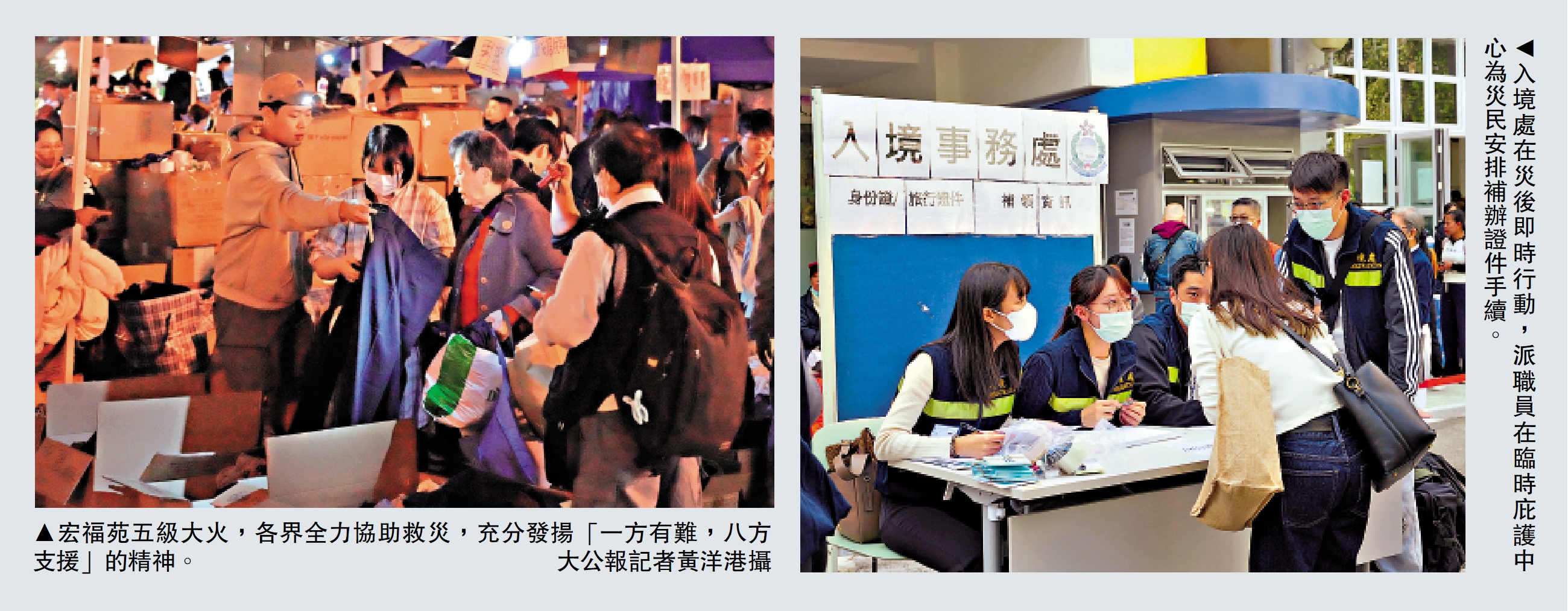 宏福苑11月26日發生五級大火,數以千計的災民遭受打擊,政府及社會各界迅速響應,紛紛伸出援手,為災民提供充足的物資、臨時住所、援助金、關懷及社會服務等,瞬時間凝聚起強大的社會力量共渡時艱。