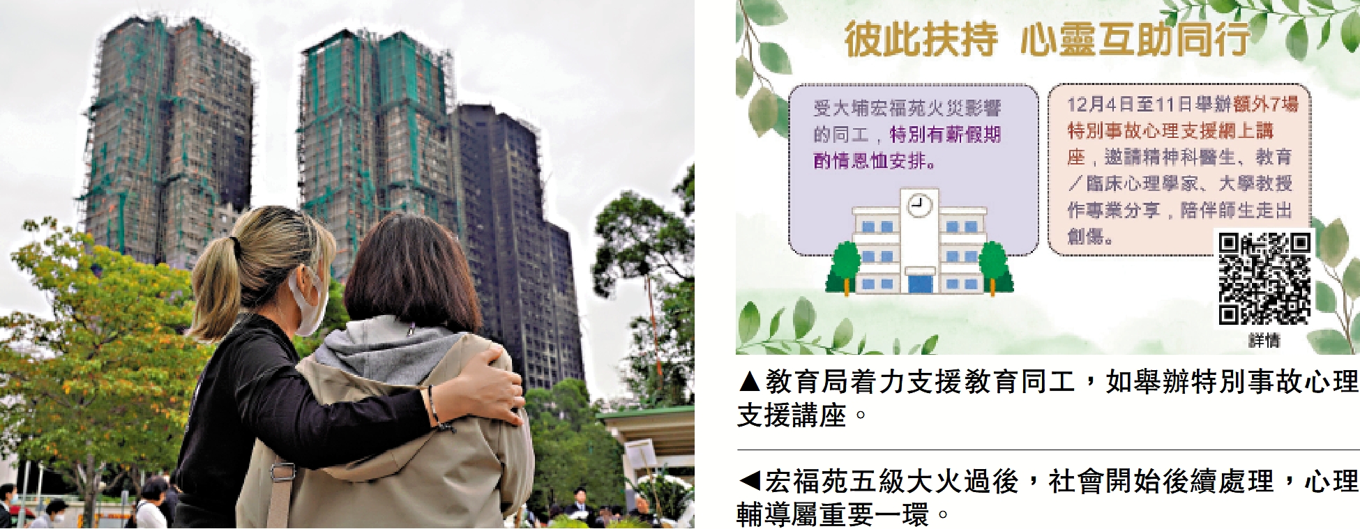 大埔宏福苑於上周三(11月26日)發生五級大火,教育局局長蔡若蓮昨日在社交平台上表示,當局亦高度關注教育同工的情況,若有學校教職員是大埔宏福苑居民,或其親屬是大埔宏福苑的居民,而該教職員是他們的唯一或主要照顧者,可放取特別有薪假期,讓他們能安心處理個人及家庭需要。\大公報記者 郭如佳