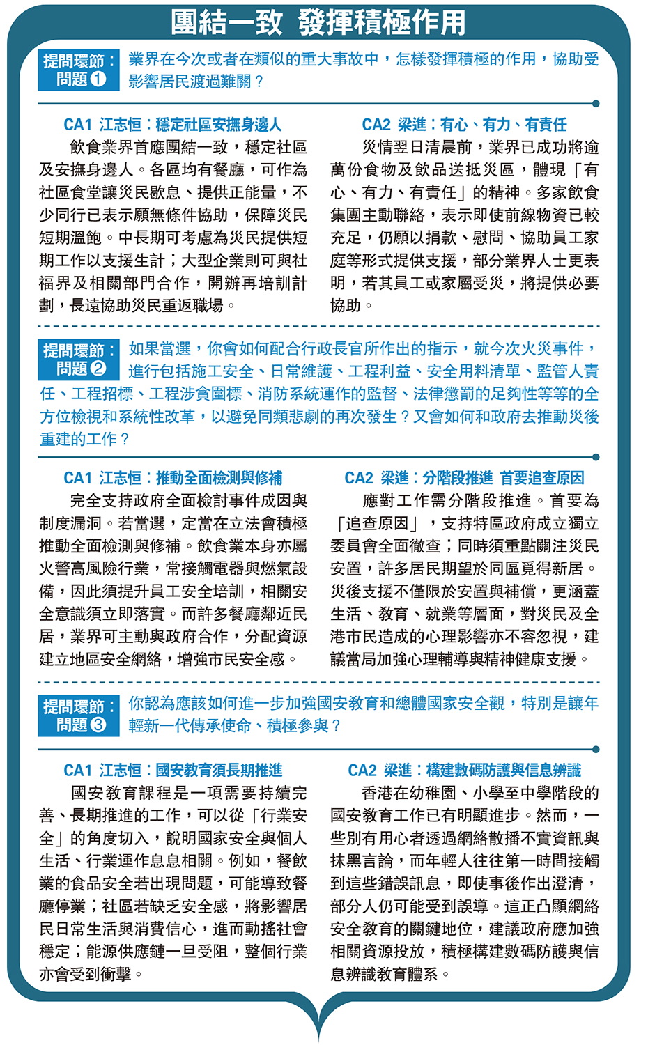 完全支持政府全面檢討事件成因與制度漏洞。若當選,定當在立法會積極推動全面檢測與修補。飲食業本身亦屬火警高風險行業,常接觸電器與燃氣設備,因此須提升員工安全培訓,相關安全意識須立即落實。而許多餐廳鄰近民居,業界可主動與政府合作,分配資源建立地區安全網絡,增強市民安全感。