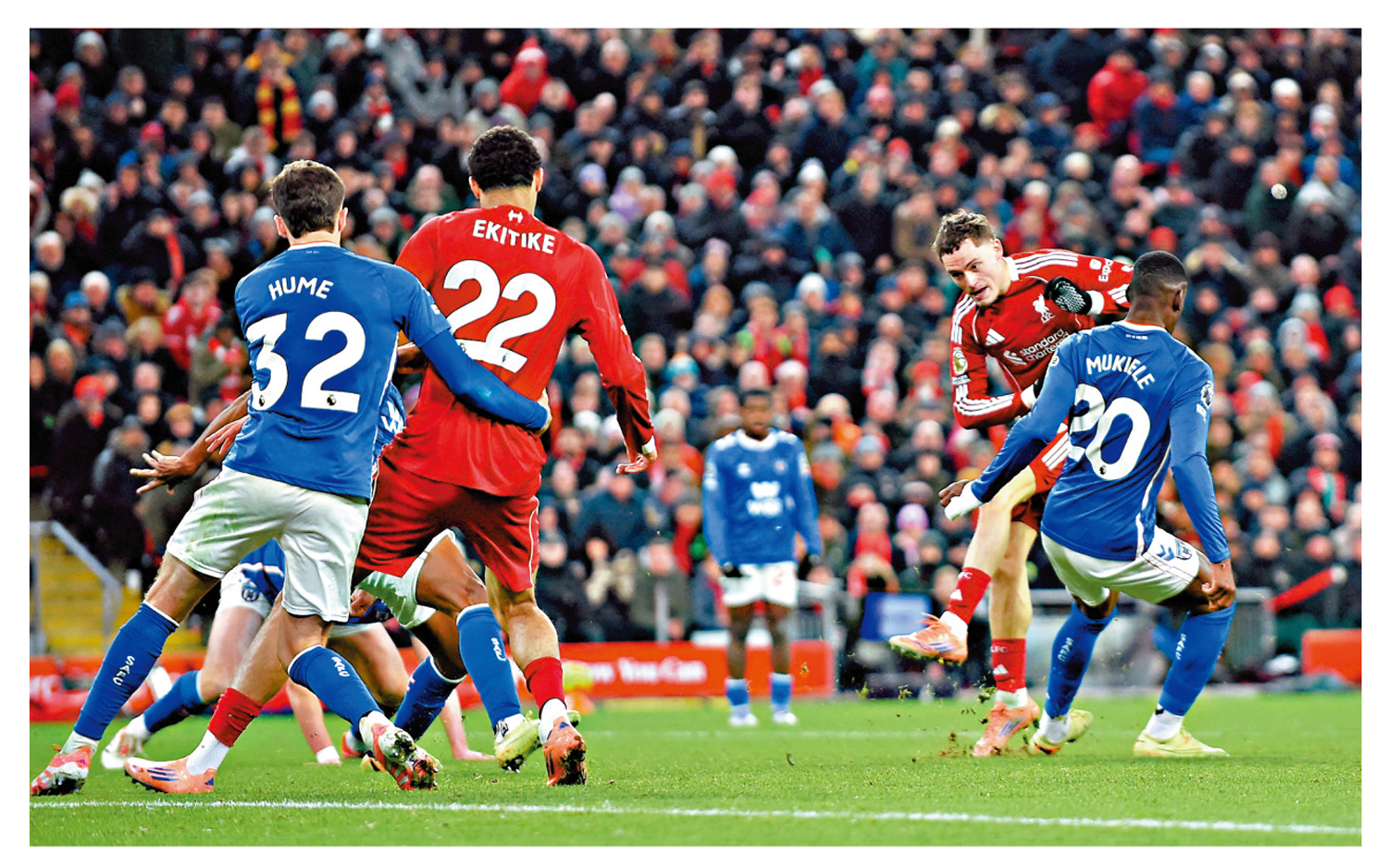利物浦於4日的英超快車主場對新特蘭,後者於67分鐘率先取得入球,利物浦至81分鐘才由科利安華迪斯(右二)射門省中守衛入網,最終判定為「烏龍球」追成1:1完場,勉強取回1分。利物浦主帥史洛特賽後表示,晏菲路的主場威力未有改變,但與己隊交戰的對手心態卻改變了,對手已經不再害怕我們,都認為能擊敗利物浦,他們的信心提升了表現。\路透社