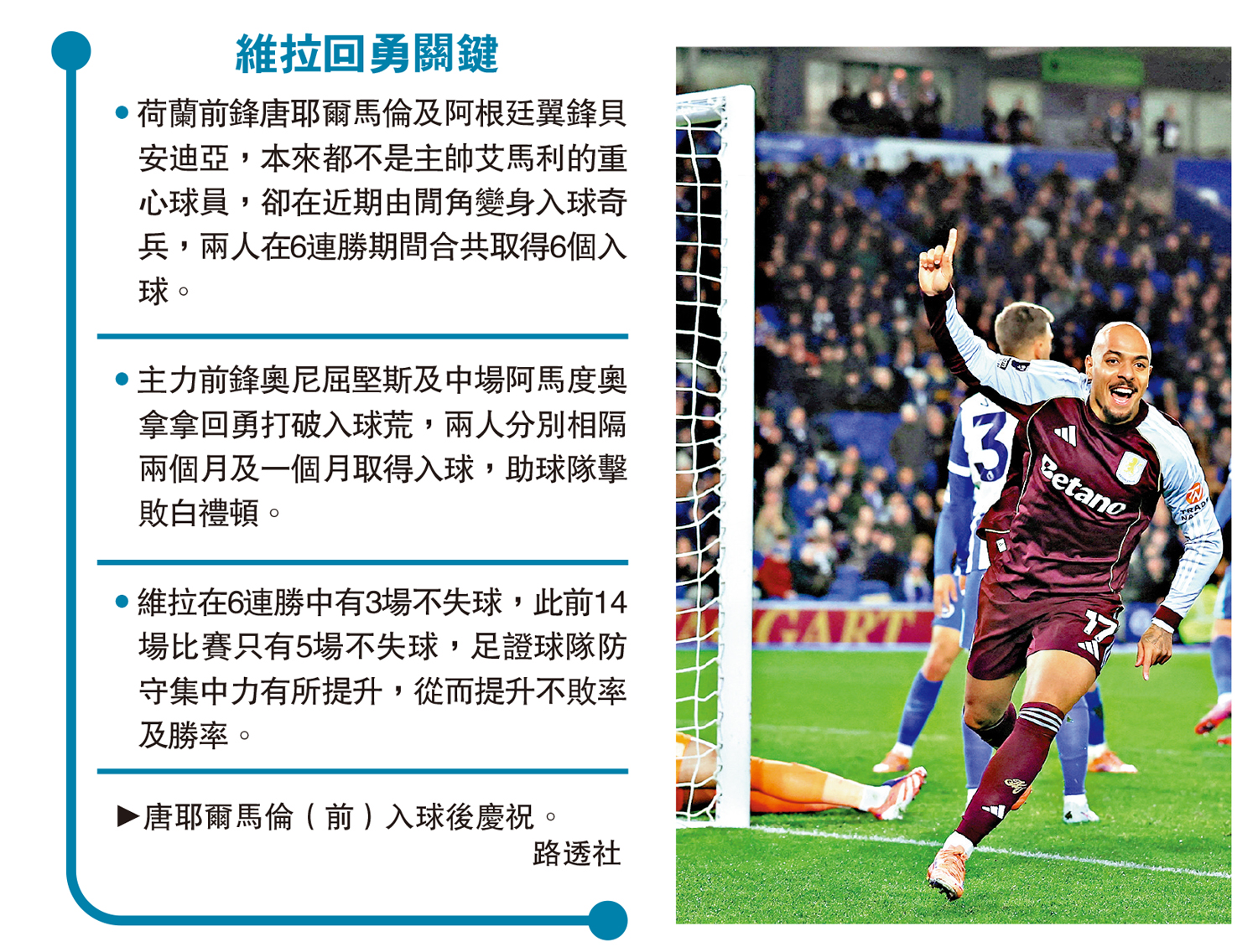 •維拉在6連勝中有3場不失球,此前14場比賽只有5場不失球,足證球隊防守集中力有所提升,從而提升不敗率及勝率。