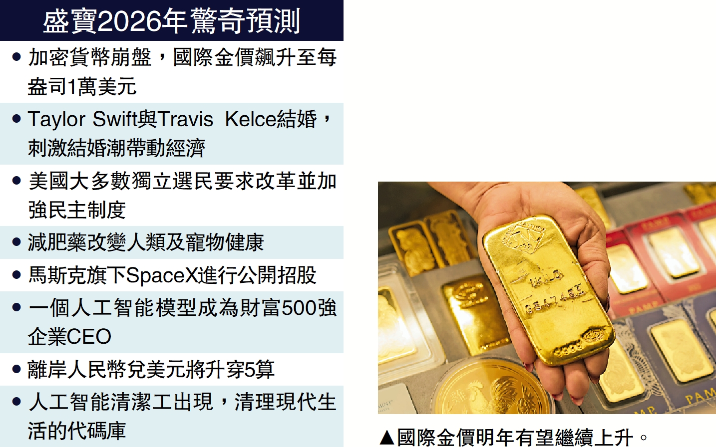 盛寶銀行最新發布的《2026年驚人預測》,第一個預測是「Q日」在2026年突然到來,量子電腦可以輕鬆破解數位鎖,導致加密貨幣崩盤,黃金價格飆升至每盎司1萬美元。