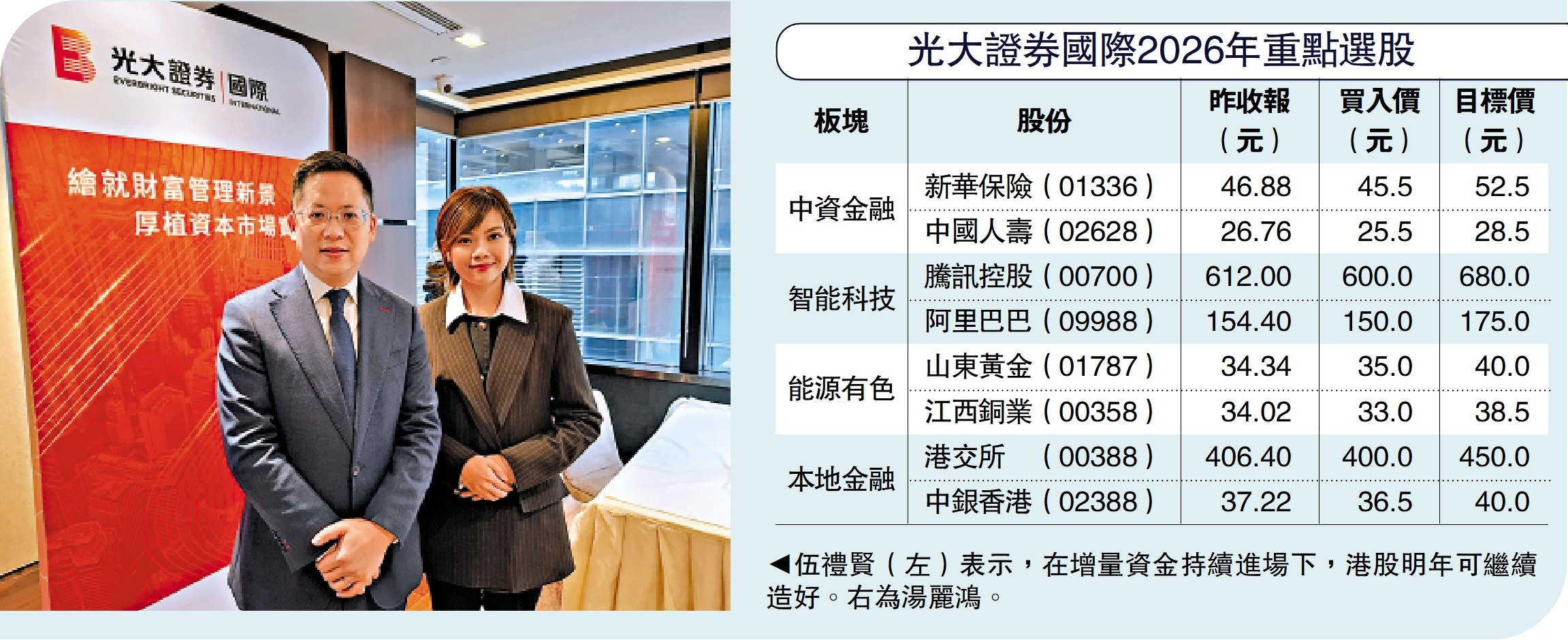 板塊偏好方面,伍禮賢認為,投資者可在中資金融、智能科技、能源有色、本地金融等板塊發掘機會,新華保險(01336)、阿里巴巴(09988)等屬於明年重點股份。\大公報記者 劉鑛豪
