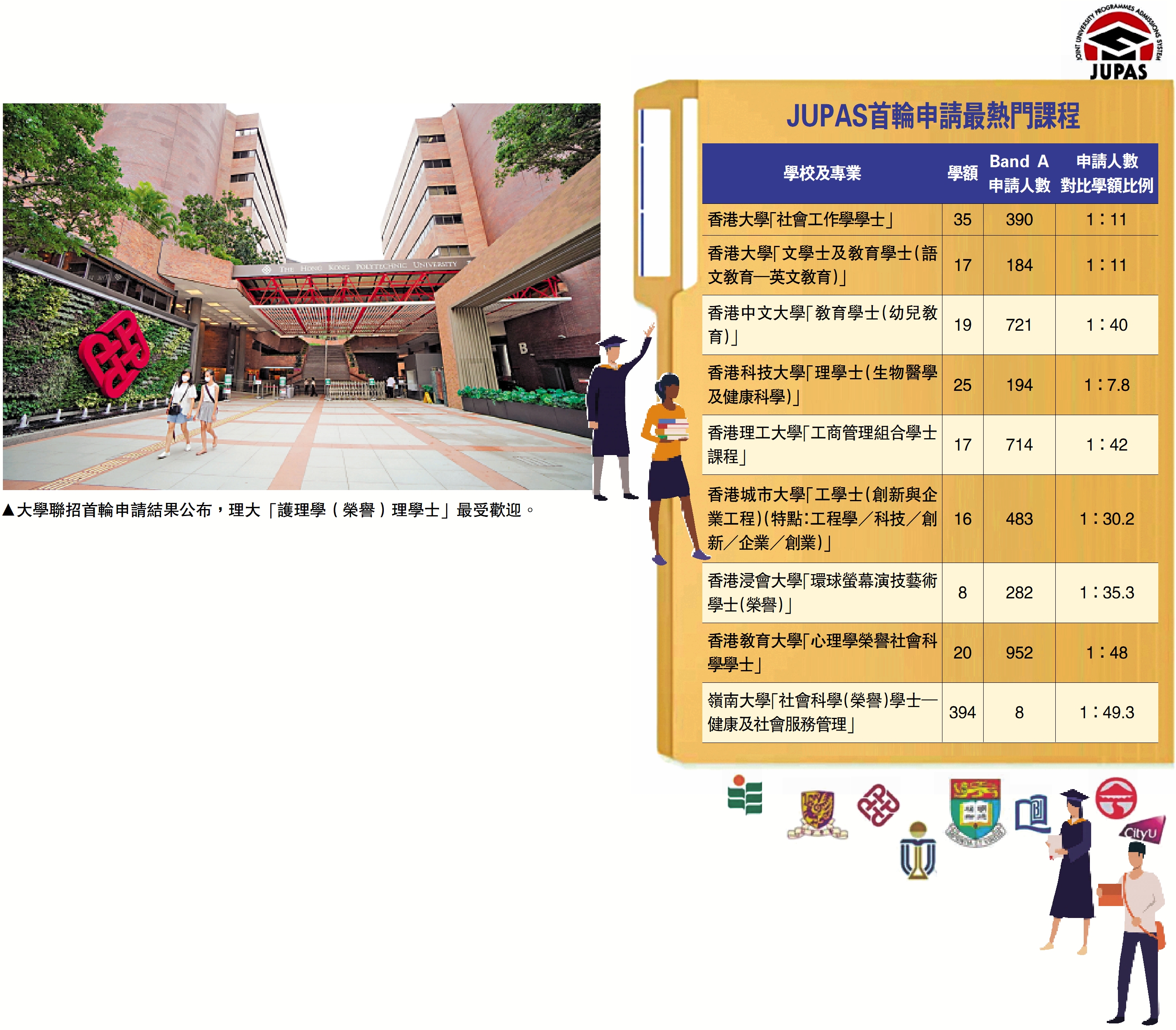 2026/27學年大學聯招(JUPAS)首輪申請於12月3日截止,八間資助大學公布各課程Band A申請人數,各院校最多人列為首三的課程類型大致與去年相若。其中,香港理工大學「護理學(榮譽)理學士」最受歡迎,有2236人報名。