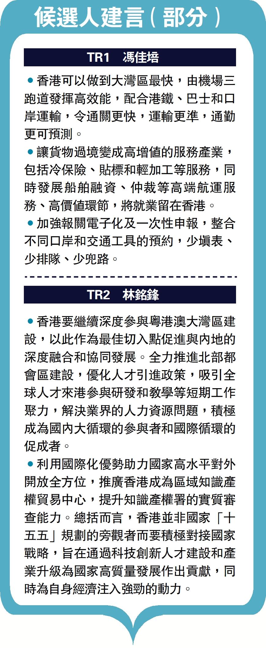 •香港要繼續深度參與粵港澳大灣區建設,以此作為最佳切入點促進與內地的深度融合和協同發展。全力推進北部都會區建設,優化人才引進政策,吸引全球人才來港參與研發和教學等短期工作聚力,解決業界的人力資源問題,積極成為國內大循環的參與者和國際循環的促成者。