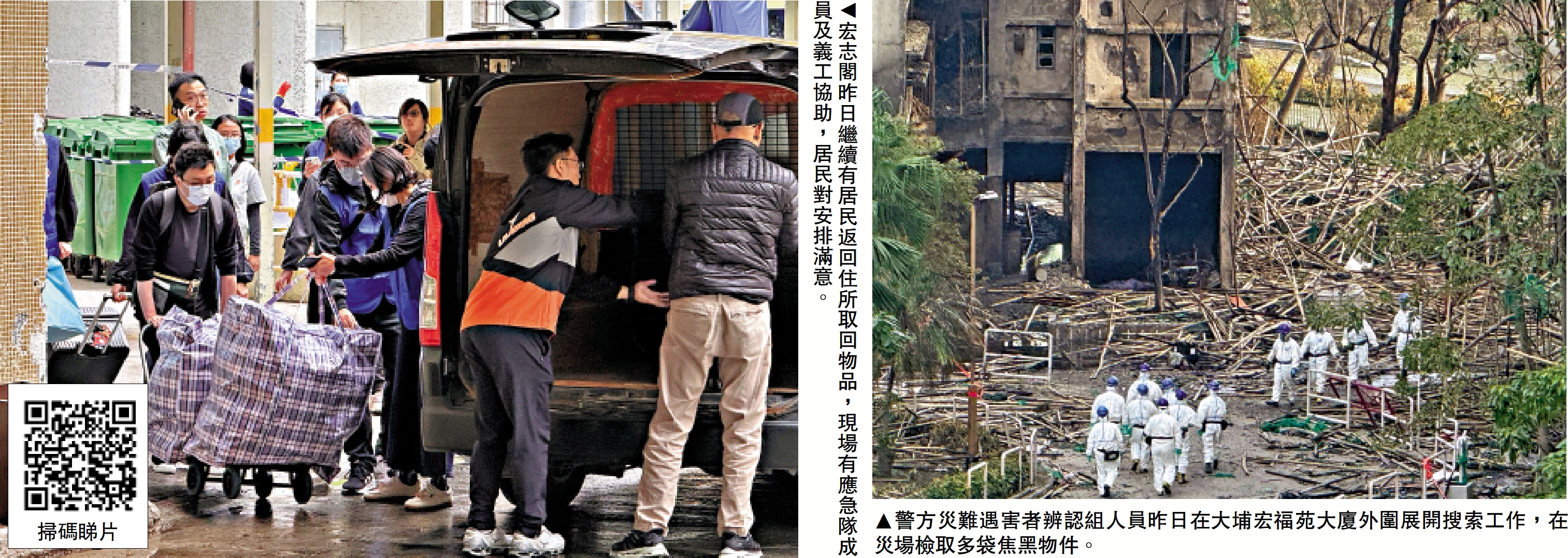 警方災難遇害者辨認組(DVIU)與鑒證科及消防人員,昨日對大埔宏福苑大廈外圍展開搜索工作,在災場檢取多袋焦黑物件。其間,人員再在宏福苑單位內救出多隻生還的動物,包括貓、龜及多條寵物魚。宏志閣昨日繼續有居民返回住所取回物品,有住客表示對政府的安排和調查進度滿意,期望調查盡快水落石出。\大公報記者 盛德文(文)調查組(圖)
