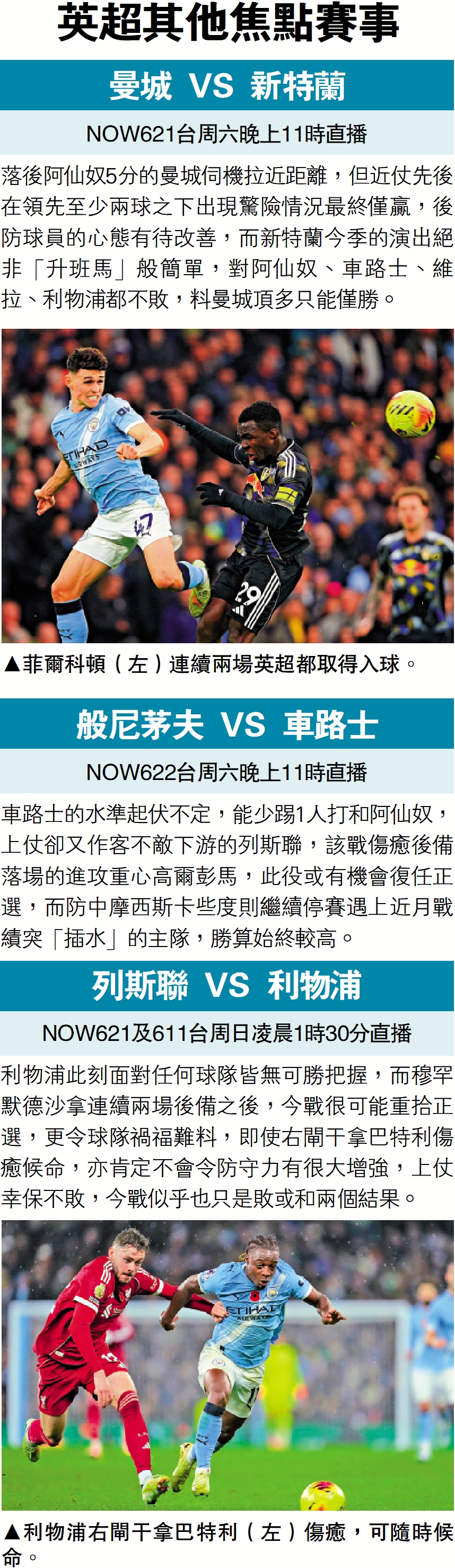 落後阿仙奴5分的曼城伺機拉近距離,但近仗先後在領先至少兩球之下出現驚險情況最終僅贏,後防球員的心態有待改善,而新特蘭今季的演出絕非「升班馬」般簡單,對阿仙奴、車路士、維拉、利物浦都不敗,料曼城頂多只能僅勝。
