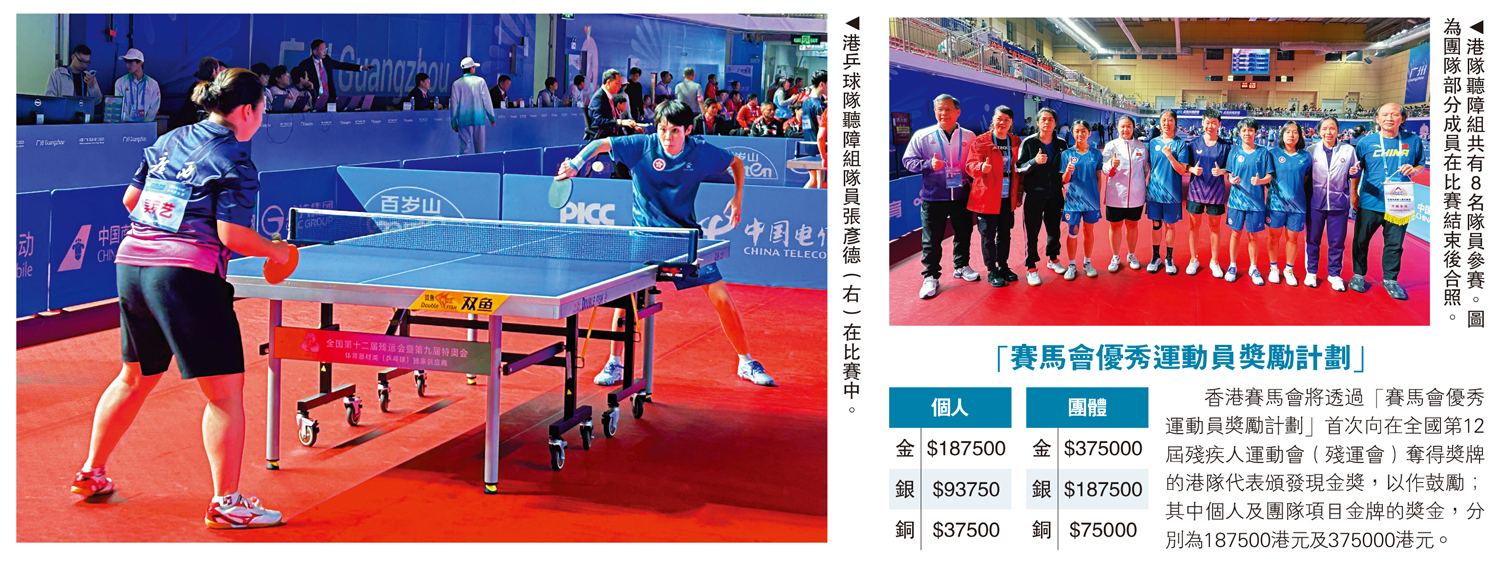 5日,全國第12屆殘疾人運動會暨第9屆特殊奧林匹克運動會「南方電網盃」乒乓球比賽在廣州體育職業技術學院拉開戰幕,31支隊伍318名運動員參與,角逐廣州賽區68枚金牌。其中,香港派出30名運動員,在所有參賽隊伍中規模最大,將參與輪椅組、企立組、聽力殘疾組三個組別。港隊企立組、輪椅組主教練張佳表示,港隊在上屆獲得1金1銅,今屆將全力爭取至少5枚獎牌。至於香港賽區承辦的兩項乒乓球組別賽事,緊接6日在荃灣體育館開打。\大公報記者 敖敏輝廣州報道(文﹑圖)