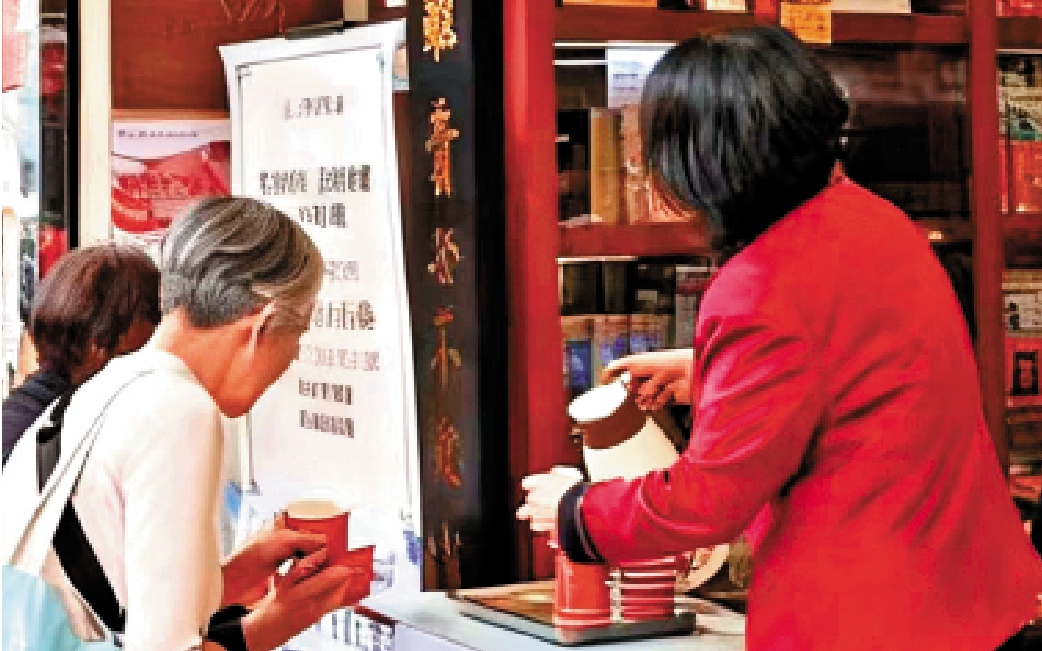 大埔廣福道、屯門、中環、北角等門店外還設立臨時服務點,備足金銀花茶飲和熱水,方便附近居民和救援人員領取。\大公報記者馬曉芳