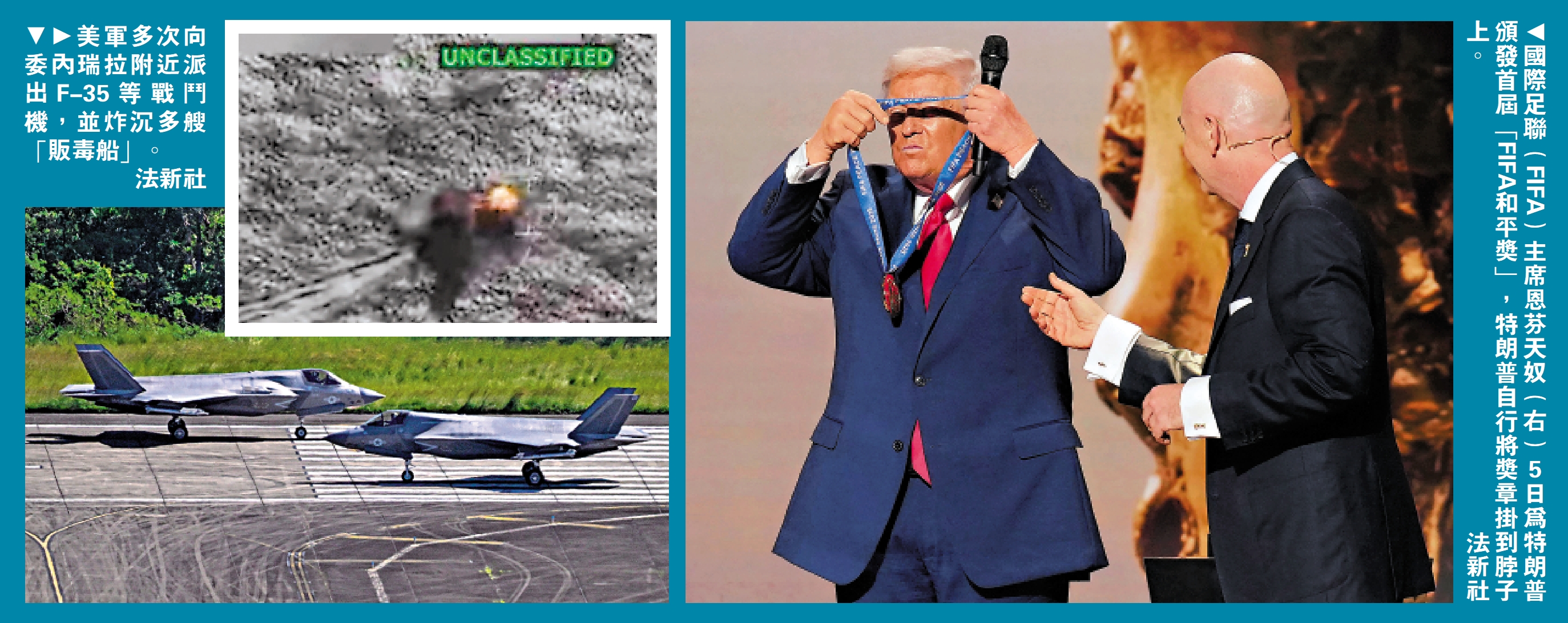 在特朗普領取「FIFA和平獎」前一天,根據美軍南方司令部4日發布的通報,美軍當天在國際水域對一艘「被認定為恐怖組織的船隻」實施打擊,打死船上4名「毒品恐怖分子」。自9月初以來,美軍已在加勒比海和東太平洋對「販毒船」進行了22次打擊,造成至少86人死亡。共和黨聯邦參議員保羅4日稱,五角大樓頻頻對「販毒船」發動襲擊,可能是入侵委內瑞拉的前兆。