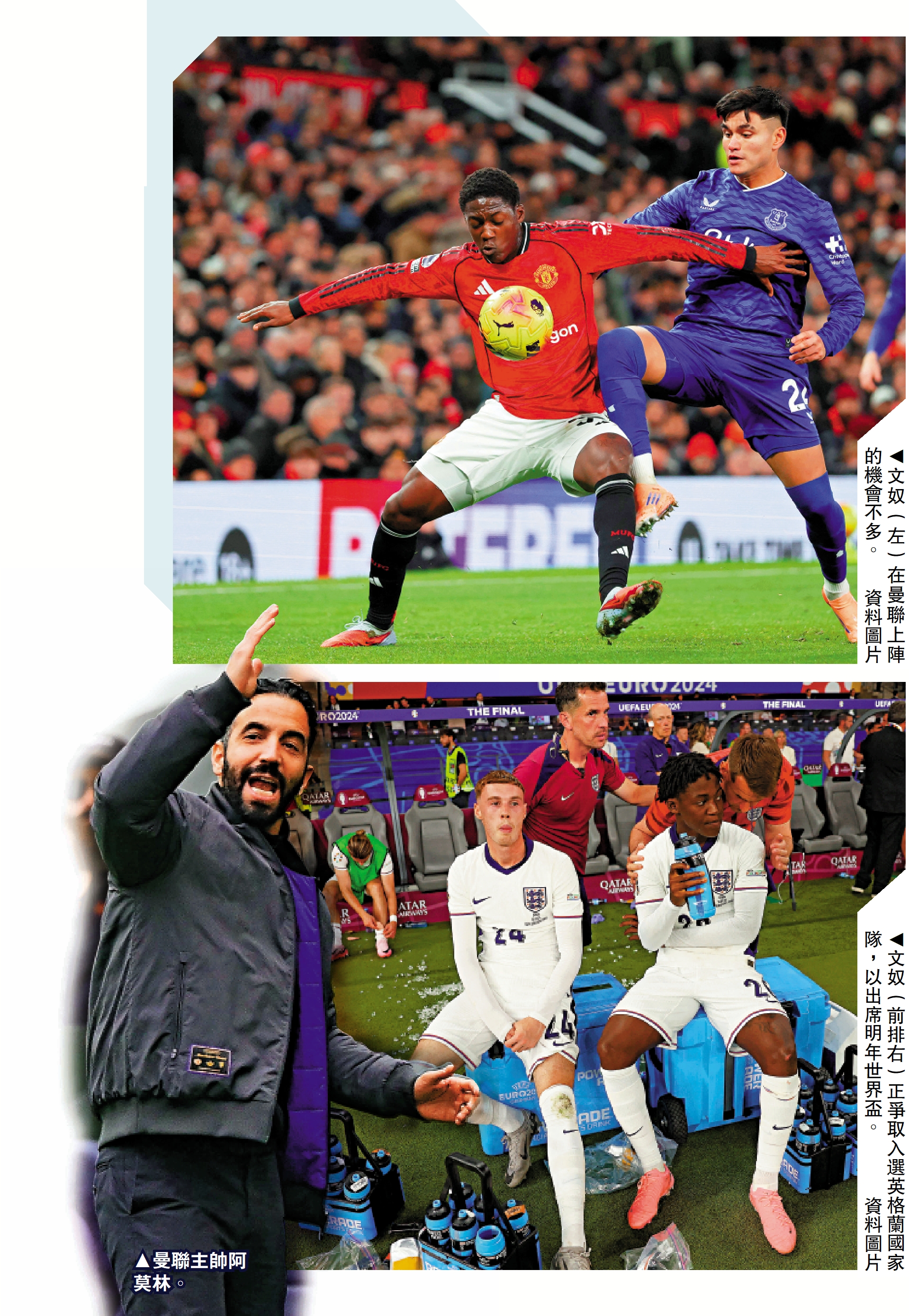 曼聯今季本有中興之象,不過最近5仗僅獲1勝,令主帥阿莫林的領導能力再次受到質疑。在中場調配方面,阿莫林已選定卡斯米路與般奴費南迪斯兩位資深球星支撐大局,結果文路爾烏加迪及文奴等球員苦無上陣機會。由於文奴需要出場機會,爭取入選英格蘭國家隊以出席明年世界盃決賽周,因此經常坐「冷板櫈」的他已萌生去意。據報有12家球會都對這位英格蘭新星感到興趣,有意在冬季轉會窗重開時出手羅致。\大公報記者 梁潤森