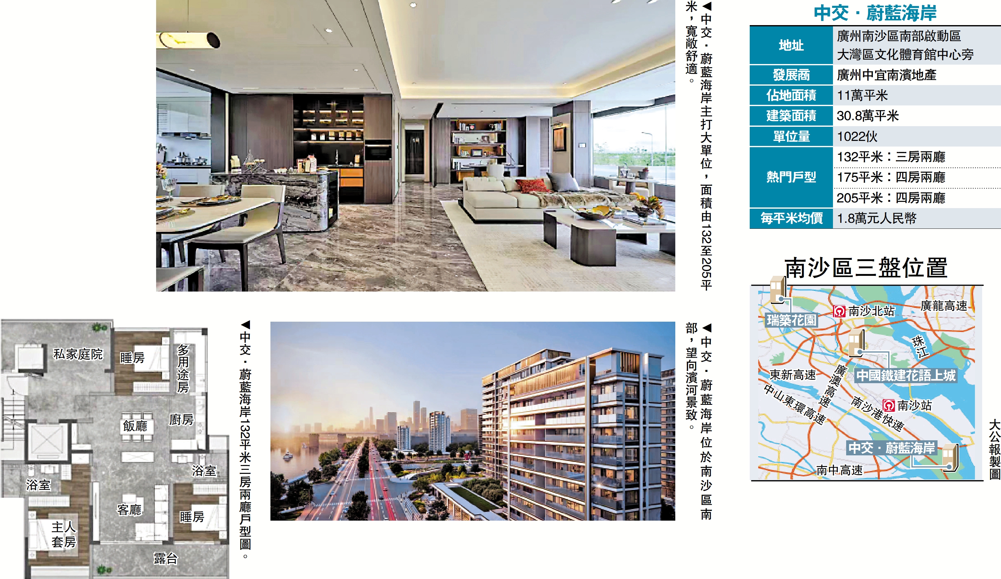 中交·蔚藍海岸以每平米均價1.6萬元(人民幣,下同,約1.75萬港元)的價格開盤,比中山市馬鞍島的價格更低,堪稱是深圳前海的超級平價替代。瑞築花園三房戶總價僅100多萬元,供抵過租,有效承接番禺區剛需買家的外溢。\大公報記者 帥誠廣州報道